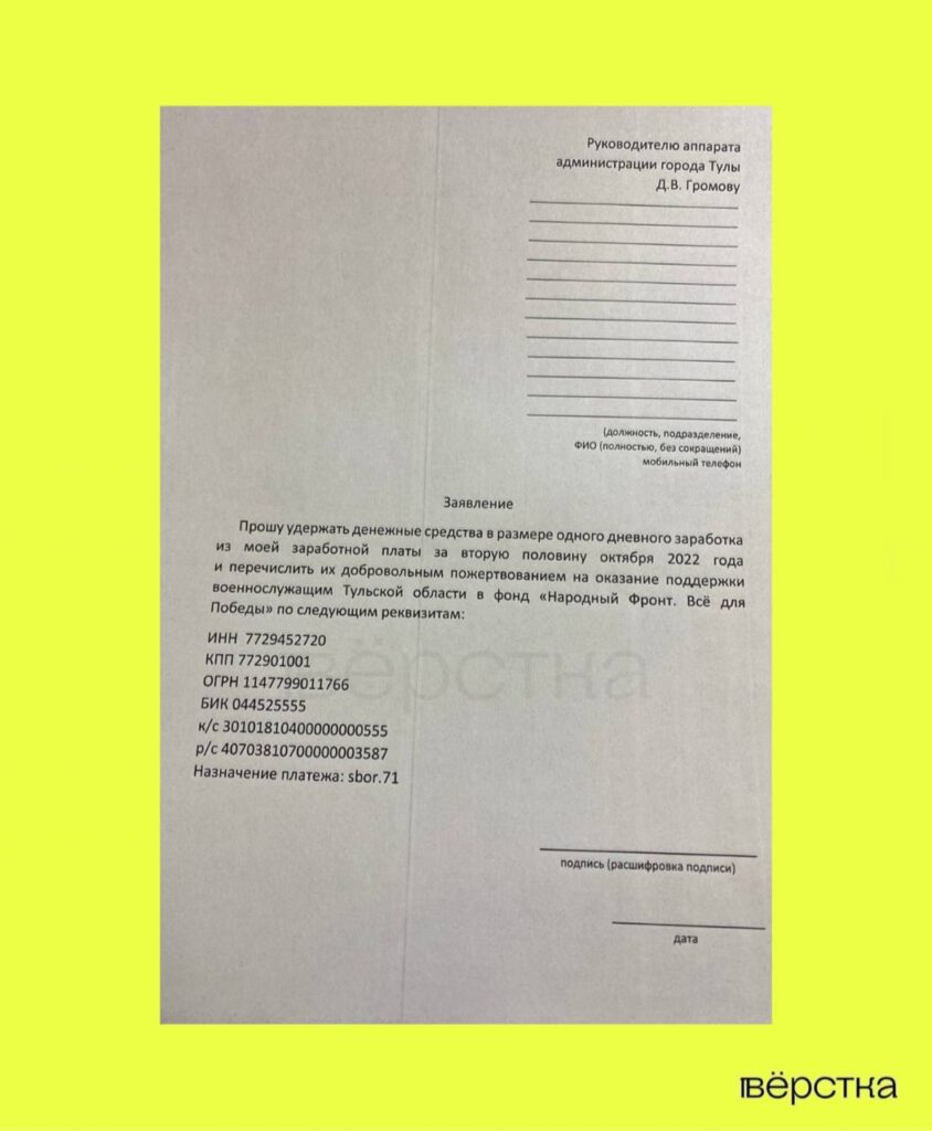 По его словам, работников администрации и муниципалитетов Тулы обязали подписать заявление об «удержании средств в размере одного дневного заработка» и переводе этих денег на нужды тульских военнослужащих в фонд «Народный фронт. Всё для победы». При этом госслужащим угрожают увольнением в случае отказа подписать заявление.