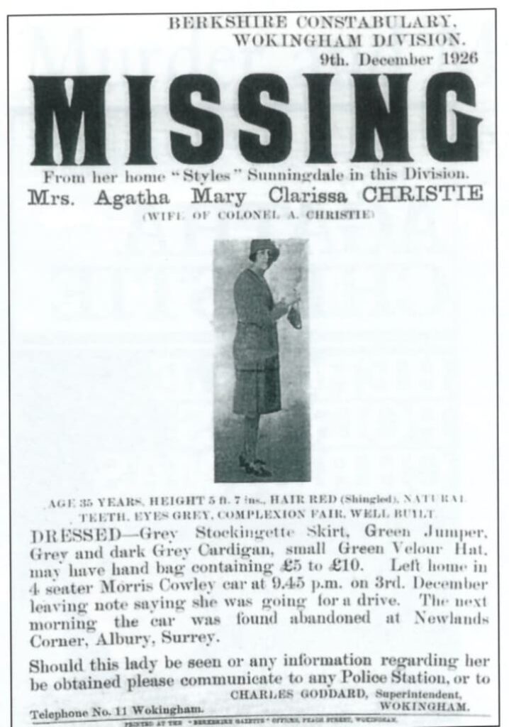 Кенворд рассылает по полицейским участкам в близлежащих районах сообщение о пропаже человека: «Из своего дома „Стайлз“ в Саннингдейле выехала в неизвестном направлении миссис Агата Мэри Кларисса Кристи, жена полковника А. Кристи, 36 лет, рост 5 футов 7 дюймов, волосы рыжие, зубы свои, глаза серые; хорошо сложена. Одета: серая юбка, зеленый джемпер, темно-синий кардиган, зеленая велюровая шляпка. С собой у нее могла быть белая сумочка, в которой находилось от пяти до десяти фунтов стерлингов. Из дома выехала в четырехместном „моррис-коули“. В оставленной миссис Кристи записке говорится, что она едет кататься. Ранним утром 4 декабря, в субботу, машина обнаружена в Ньюлэндз-Корнер, Олбьюри, графство Суррей».