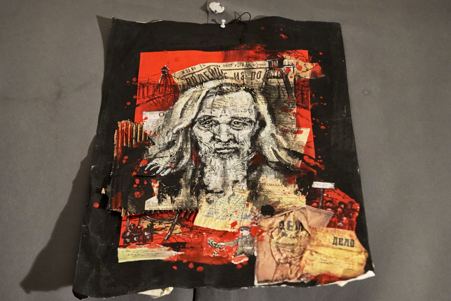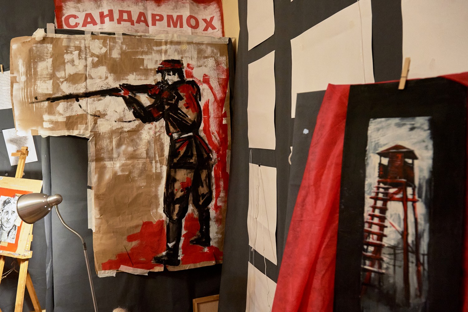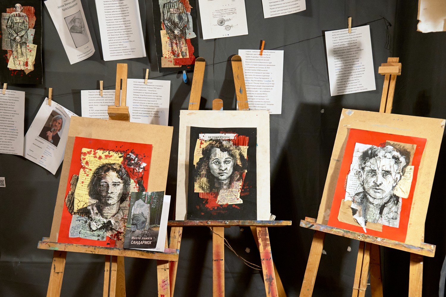 Под потолком висит портрет карельского историка Юрия Дмитриева и карты, посвященные Сандармоху. Дмитриев осужден по делу о насильственных действиях сексуального характера в отношении приемной дочери. Он должен был выйти на свободу в 2020 году, но суд ужесточил ему наказание с 3,5 до 13 лет колонии строгого режима.