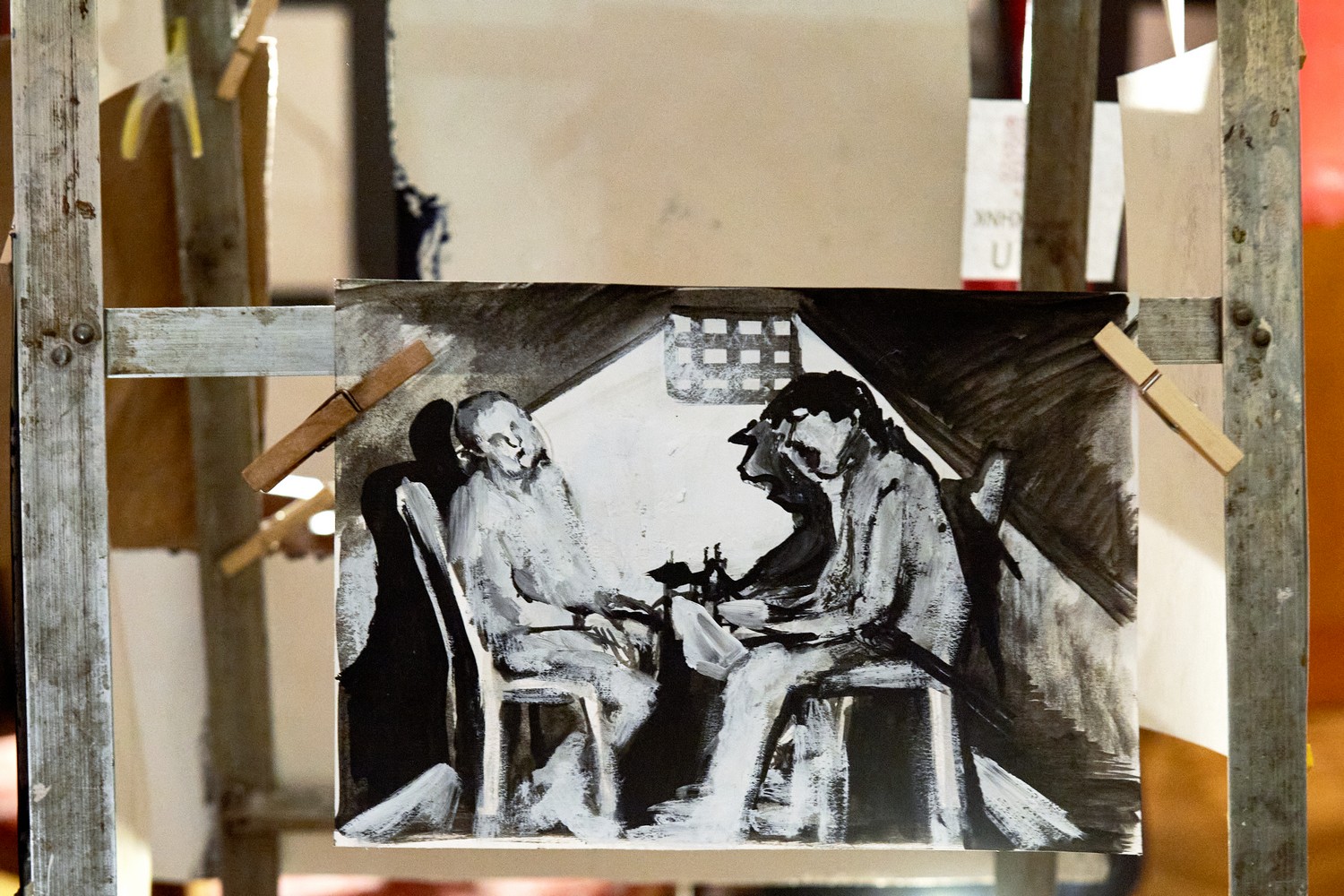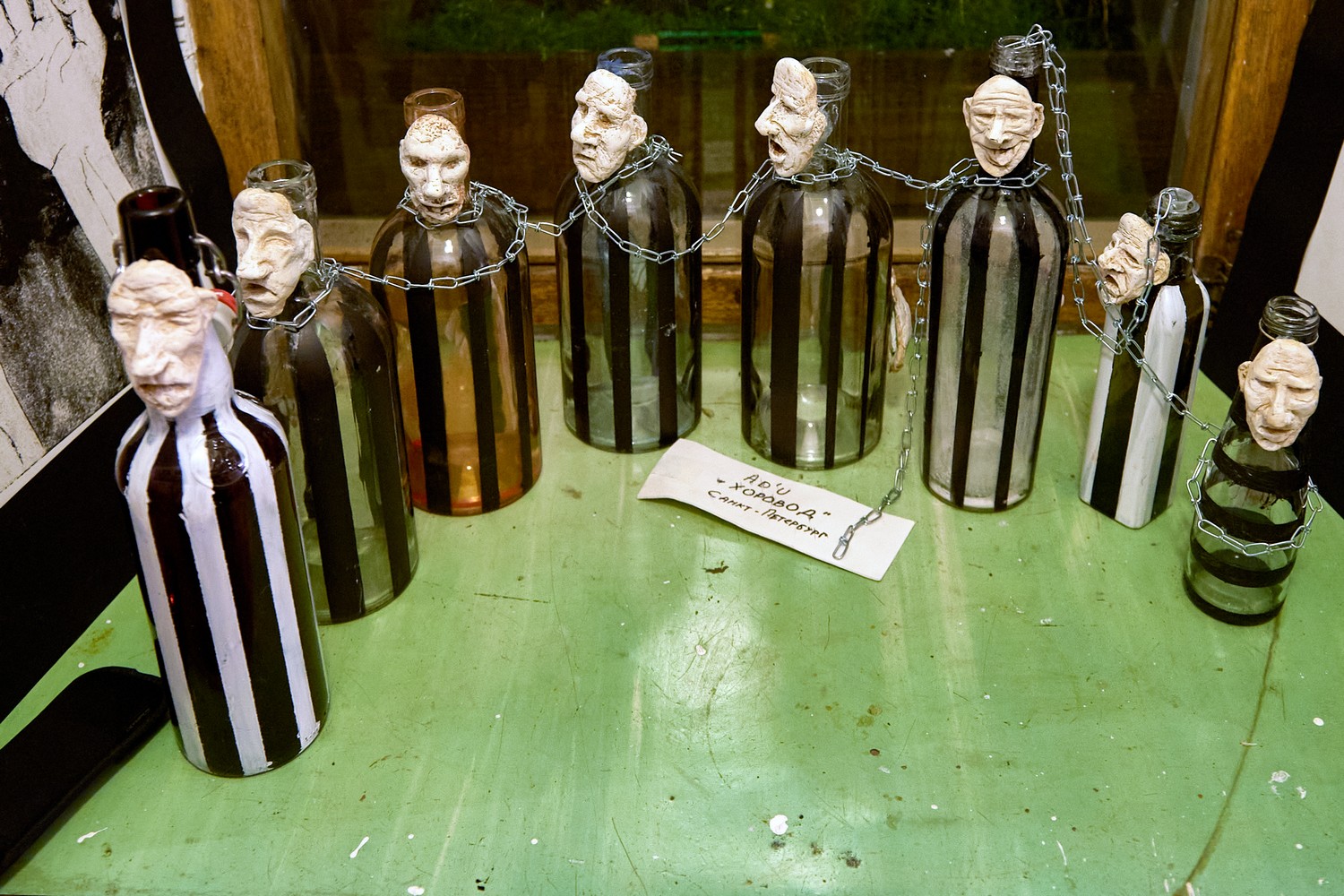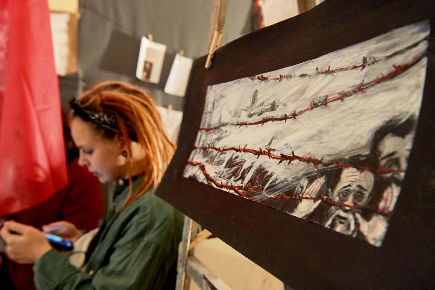 Под потолком висит портрет карельского историка Юрия Дмитриева и карты, посвященные Сандармоху. Дмитриев осужден по делу о насильственных действиях сексуального характера в отношении приемной дочери. Он должен был выйти на свободу в 2020 году, но суд ужесточил ему наказание с 3,5 до 13 лет колонии строгого режима.