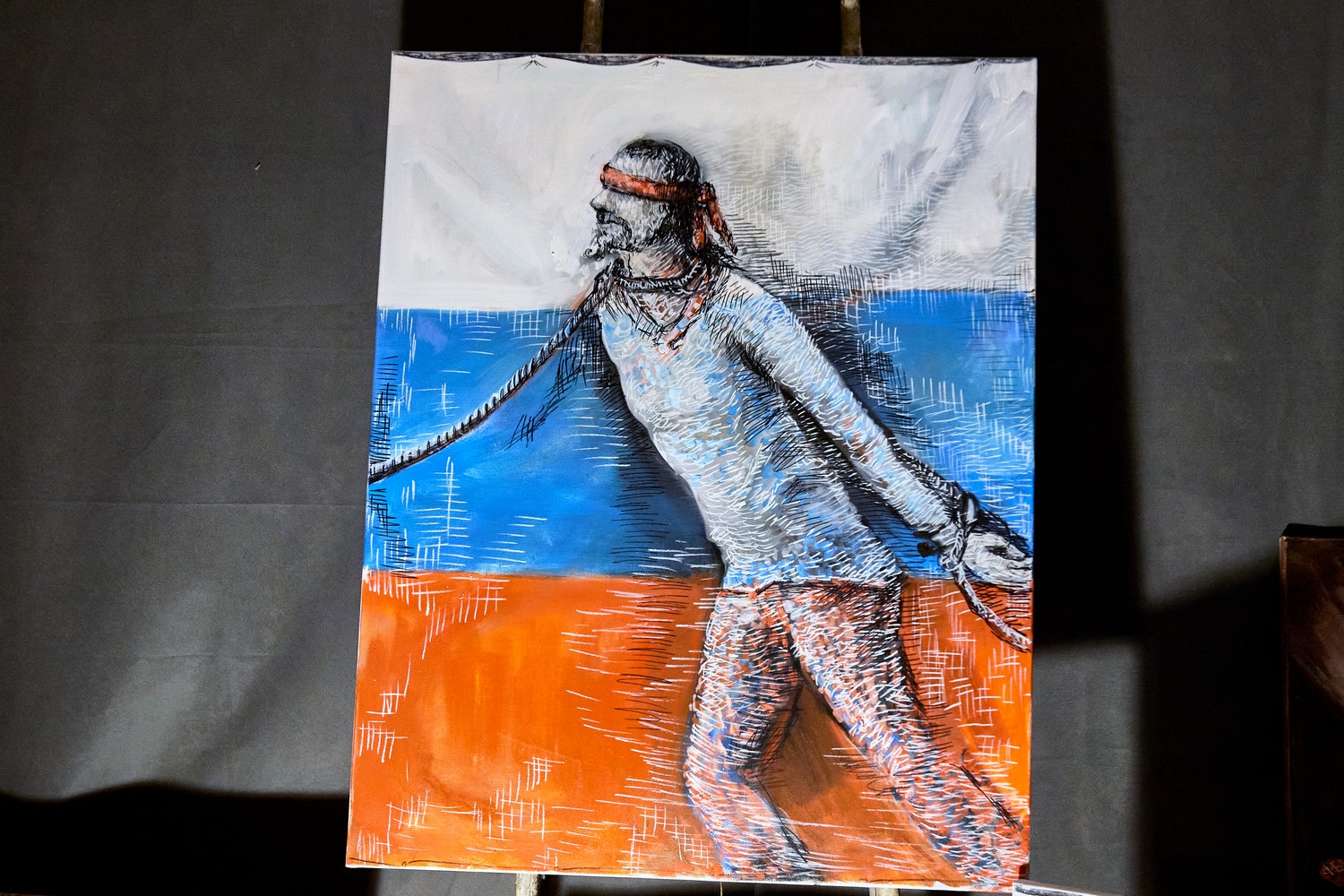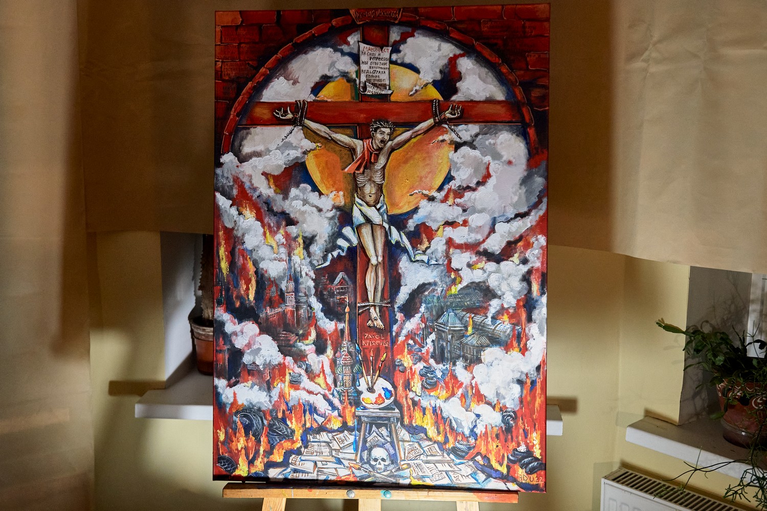 На одной из картин изображен сюжет по мотивам акции Павла Крисевича: мужчина на кресте, под ногами которого — горящие папки политических дел. Рядом — рисунки самого Крисевича, которые он делал, сидя в СИЗО, на кусках простыни из подручных материалов и самодельных красок. В октябре Крисевича, который до этого провел год в СИЗО, приговорили к 5 годам колонии.