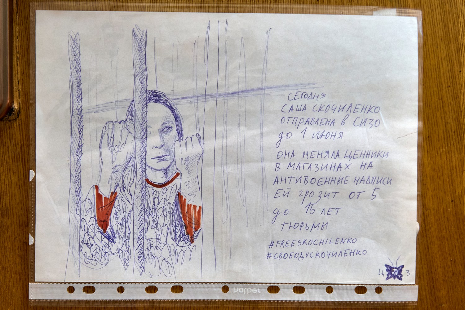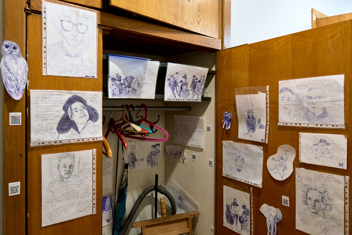 В шкафу в прихожей — рисунки художника цианида злого. С февраля он ежедневно создает по одному изображению о войне и политических репрессиях. На дверцах шкафа и внутри — портреты фигурантов дел о «военных фейках» Саши Скочиленко, Севы Королева, фигуранта дела «канских подростков» Никиты Уварова, сцены с Навальным в камере.