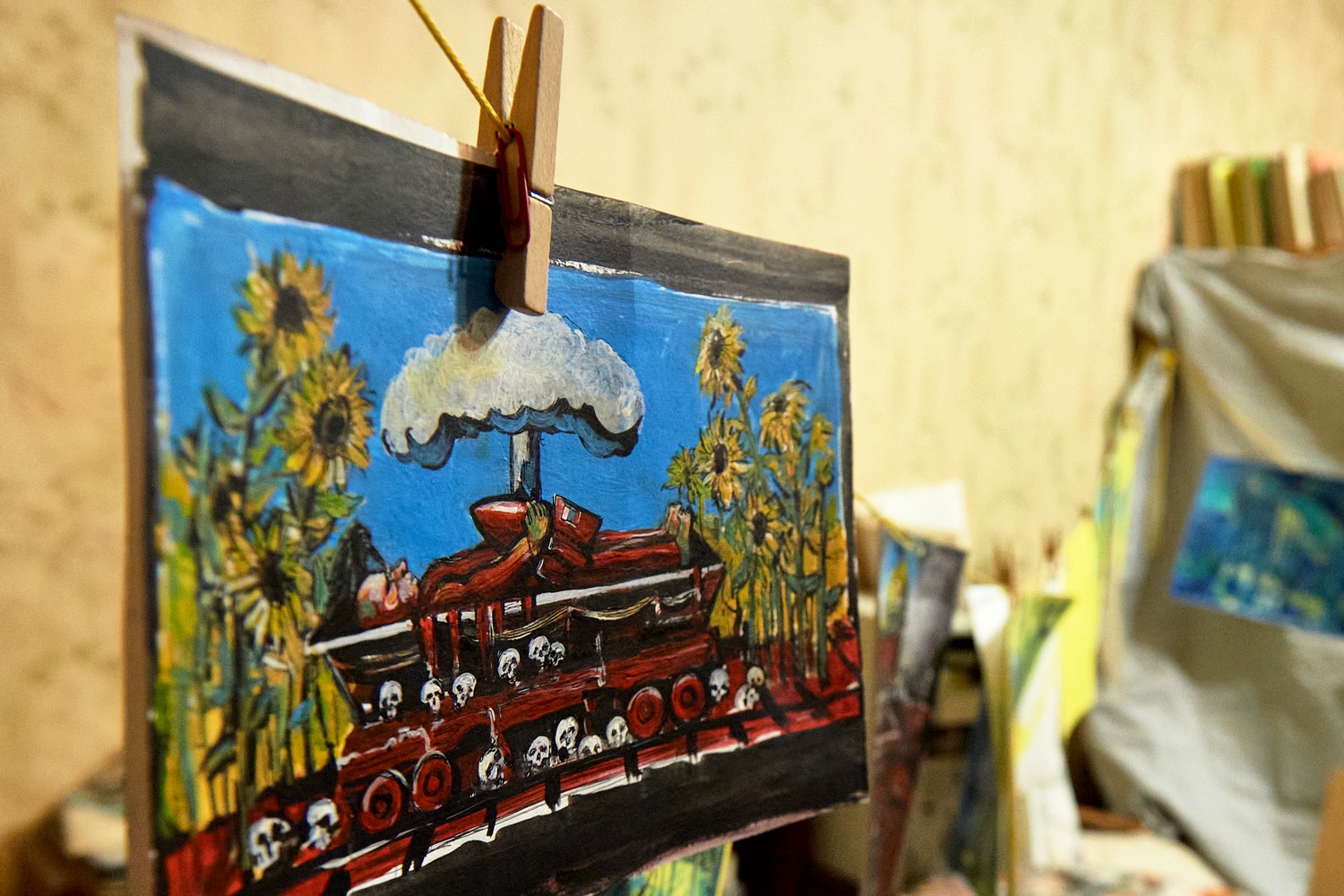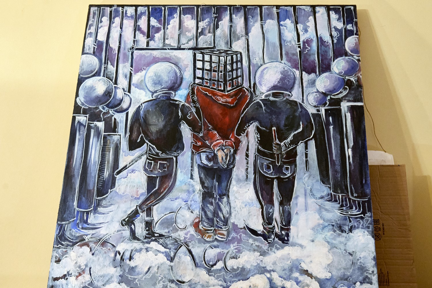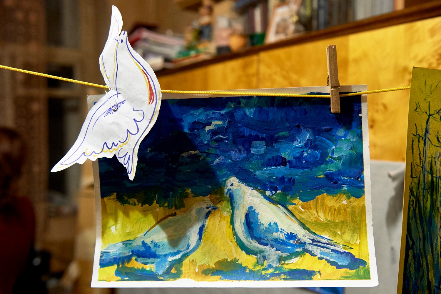 В экспозиции есть и антивоенные рисунки. Они написаны желтыми и голубыми красками. Авторка — Ad’u, которую вместе с другими художниками задержали во время митинга в апреле 2022-го, когда она рисовала ОМОН на фоне Исаакиевского собора.