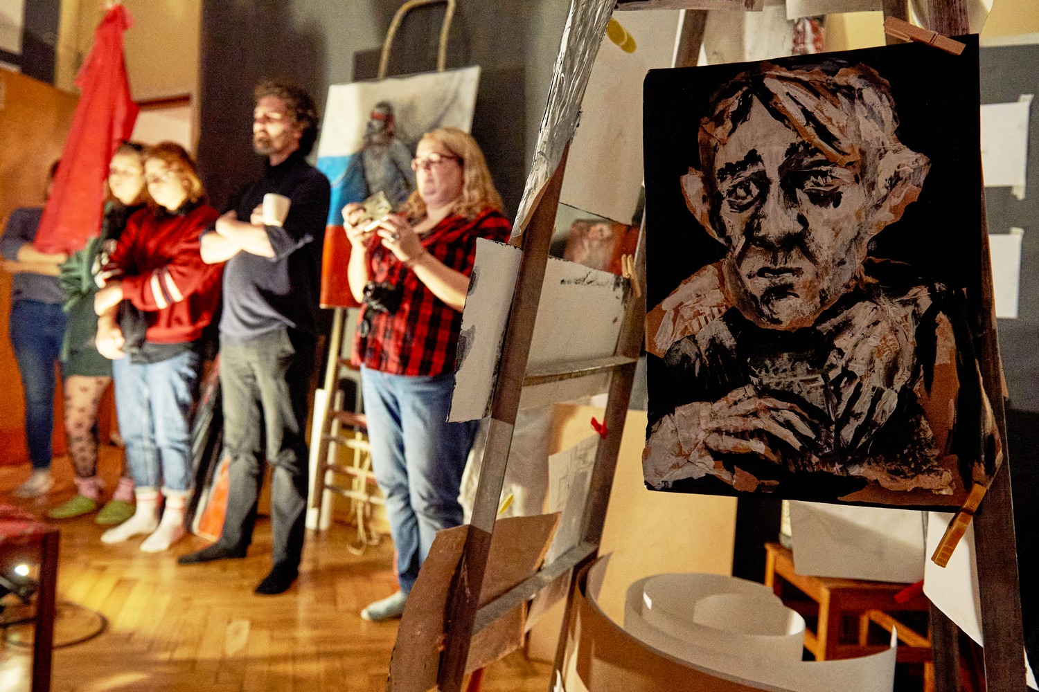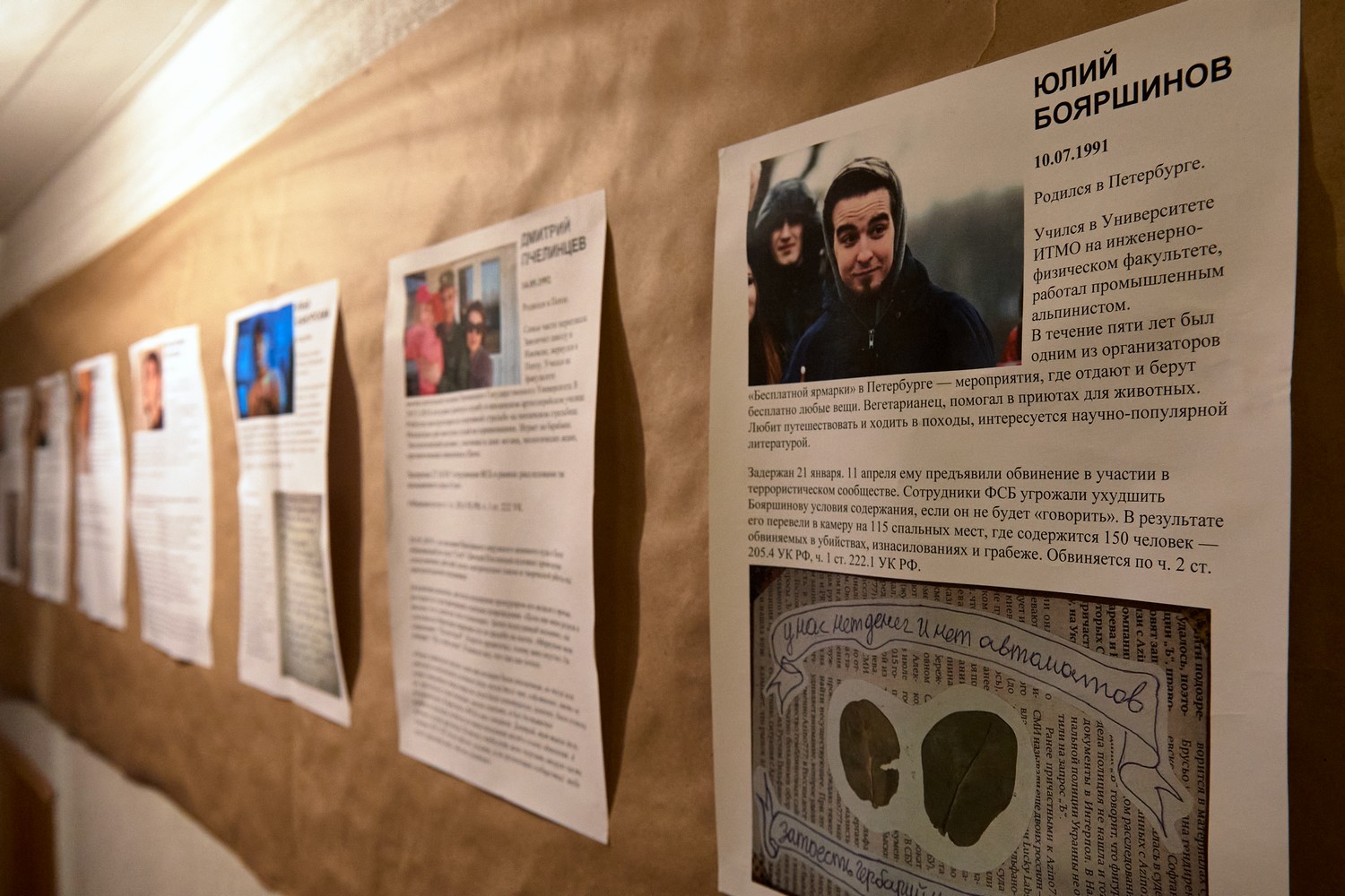 «Подпольная» выставка открылась в сентябре в частном пространстве. Организаторы уже несколько раз планировали ее закрыть, но люди продолжают приходить. «Мы не думали, что она так долго продержится. В субботу даже намечается вечер поэзии», — рассказал «Бумаге» Николай Бояршинов, отец фигуранта дела «Сети» Юлия Бояршинова.