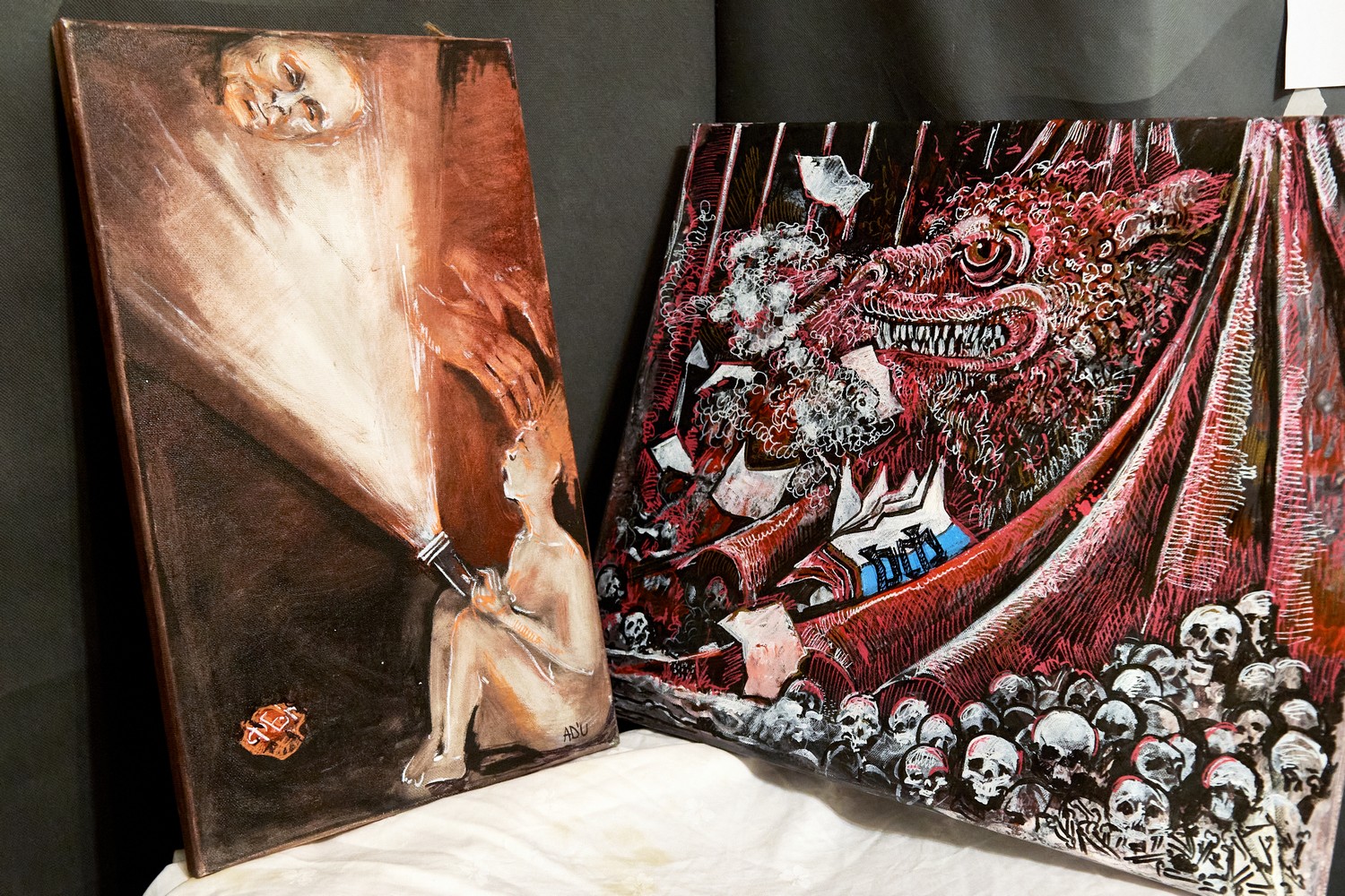 В гостиной — основном выставочном пространстве — собраны картины художницы Ad’u. Она рассказывает, что выставочные пространства не решаются брать ее работы. «Говорят: ну вы же понимаете», — делится она.