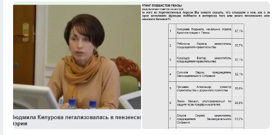 В опубликованном 28 октября РЕЙТИНГЕ ЛОББИСТОВ ПЕНЗЫ газеты «Улица Московская» по результатам ответов на вопрос «Про кого из перечисленных персон Вы можете сказать, что слышали о ней, как о лице, которое исполняло функции лоббиста в интересах того или иного пензенского или не пензенского бизнеса?» первое место с большим отрывом заняла Лариса Кипурова.
