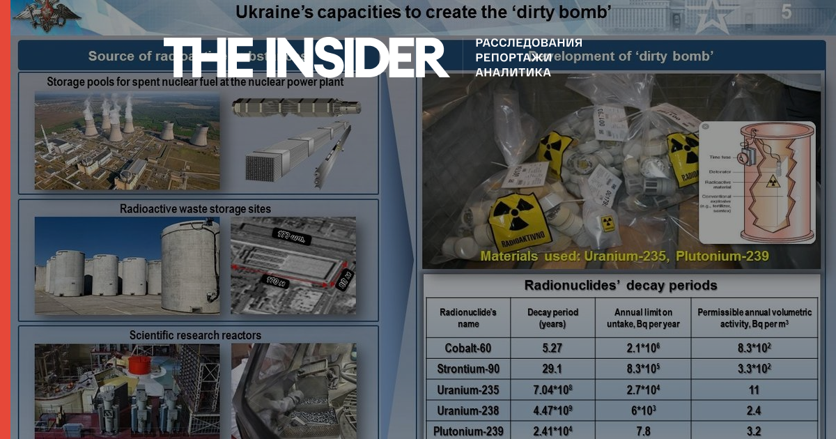 28 октября 2022Министерство обороны РФ опубликовало в своем Telegram-канале пересказ брифинга начальника войск радиационной, химической и биологической защиты ВС РФ генерал-лейтенанта Игоря Кириллова, который, как и многие другие российские официальные лица, утверждает, что Киев поручил украинским ученым создать так называемую грязную бомбу, чтобы устроить провокацию и обвинить в этом Россию. При этом свой брифинг Кириллов снабдил фотографиями, которые были призваны подтвердить эти обвинения.