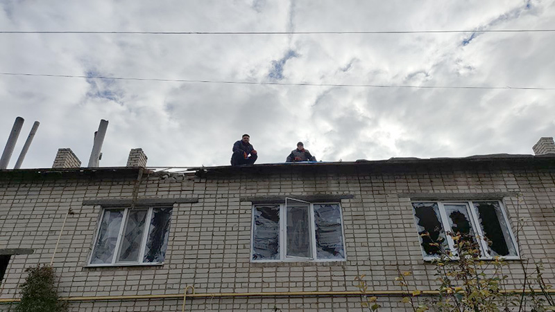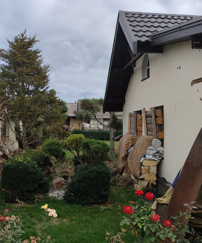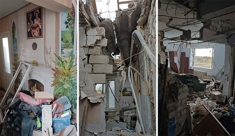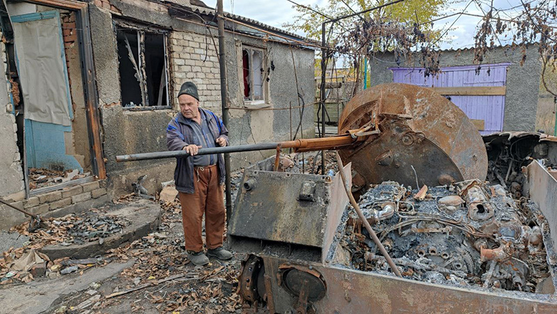 Крышу одного из этих домов двое ребят прикрывают полиэтиленом - чтобы не заливало дождями, в надежде, что дом еще удастся восстановить. Один из них - Володя Макаренко. Он из соседнего села Заречное, на другом берегу Ингульца. Село было под оккупацией недолго, всего около двух недель, но сам Володя пробыл в российском плену месяц. Рассказывает, что муж сестры позавидовал его заработкам, сдал россиянам - смотрите, мол, у него новенькие 500-гривневые купюры, это он от ВСУ получил за то, что сдавал им ваши позиции. Самое интересное, что ВСУ Володя действительно помогал. Бесплатно. Но оккупанты сами уничтожили свидетельства этой помощи: техника находилась в доме его брата. Она сгорела вместе с домом. Российские солдаты бросили туда гранаты, не заходя. Володю это спасло. И хотя его держали в тюрьме в Новой Каховке, на (до сих пор) оккупированной территории, откуда выпустили без документов (заставляли взять российский паспорт - Володя отказался), он смог пробраться домой. За взятку и благодаря помощи добрых людей.