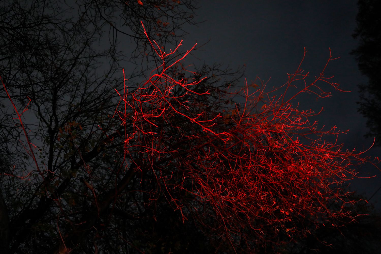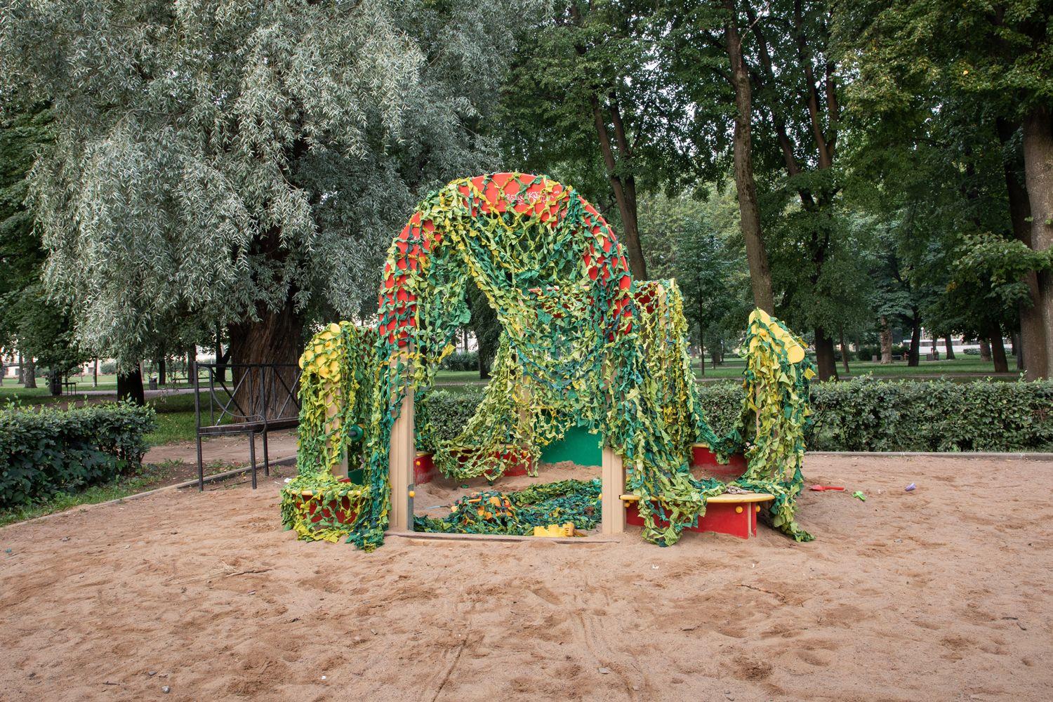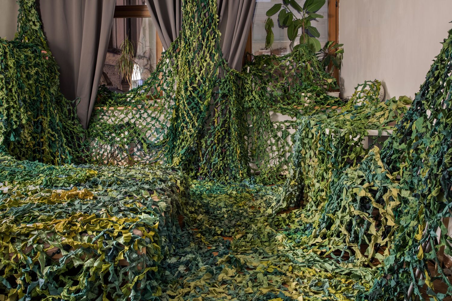 На этих снимках детская площадка и комната в моем доме, укрытые маскировочными сетками. Эти сетки я плела все лето и осень 2021 года, чтобы снять серию фотографий о милитаризации детства, на которых были бы изображены детские площадки, укрытые такими сетками. С приходом войны работа над проектом стала невозможна. После наступления мобилизации возникли новые смыслы: под угрозой оказалось благополучие моей собственной семьи. Теперь мы живем в постоянном страхе, что мужа заставят идти воевать, а дети останутся без отца. Эти фотографии — мой символический жест матери и жены в попытке укрыть, защитить свою семью от войны.