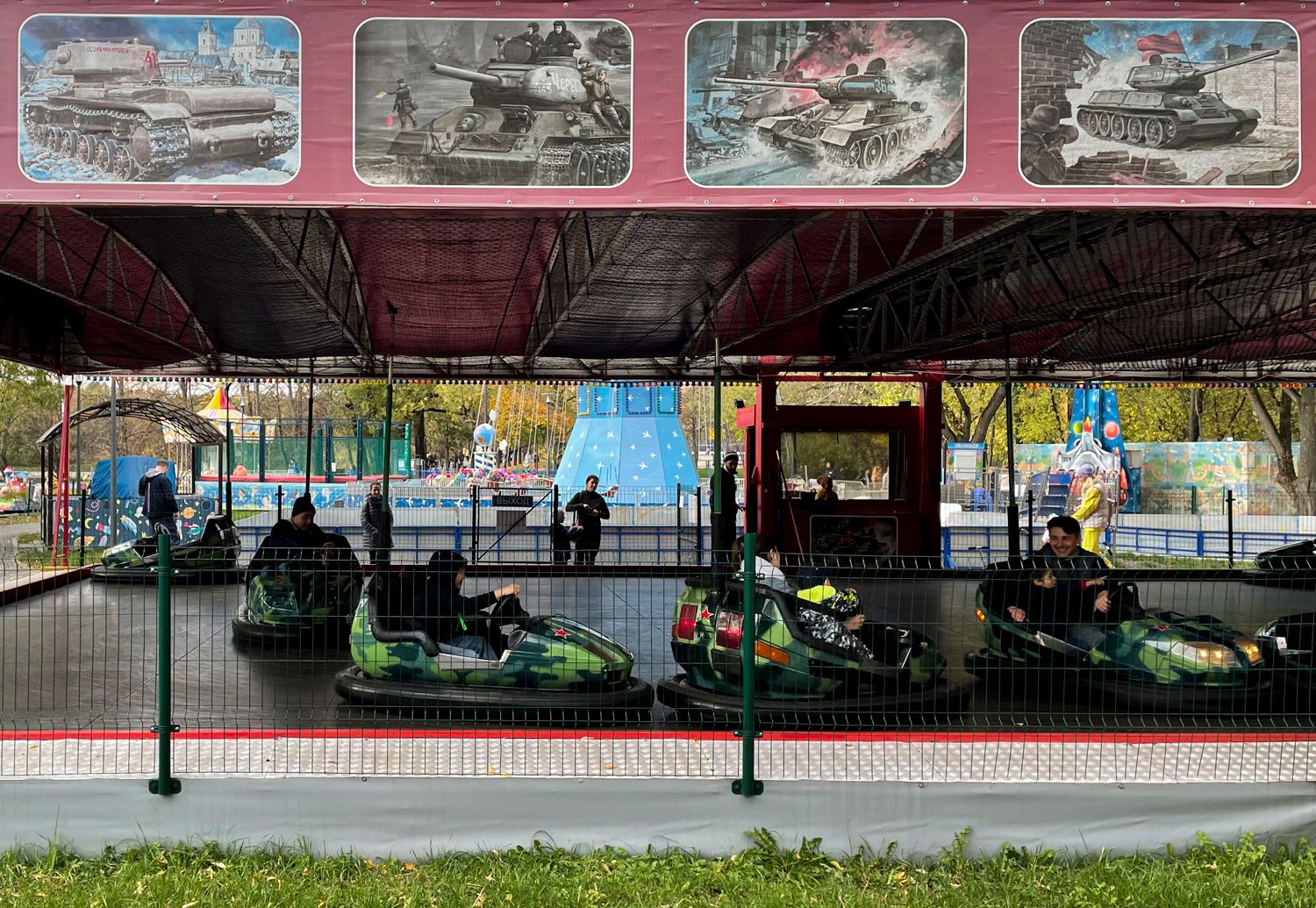 После начала войны я переехал и стал жить рядом с этим парком. Каждый раз, когда я иду от дома до метро, я прохожу этот аттракцион. И каждый раз смотрю на изображения танков и электрические машинки, разрисованные красными звездами и военным камуфляжем, с веселыми людьми, катающимися в них. И на вопрос, хотят ли русские войны, каждый раз вижу ответ. Я очень устал, я даже не могу переубедить одного моего родного человека по поводу войны. У меня нет внутренних сил, чтобы ловить «решающий момент», выстраивать композицию, ждать света. Я просто нажал кнопку и снял, как оно есть. Для меня сейчас не время эстетики в фотографии. Главная реакция от фотографии сейчас — это не wow, а ужас.