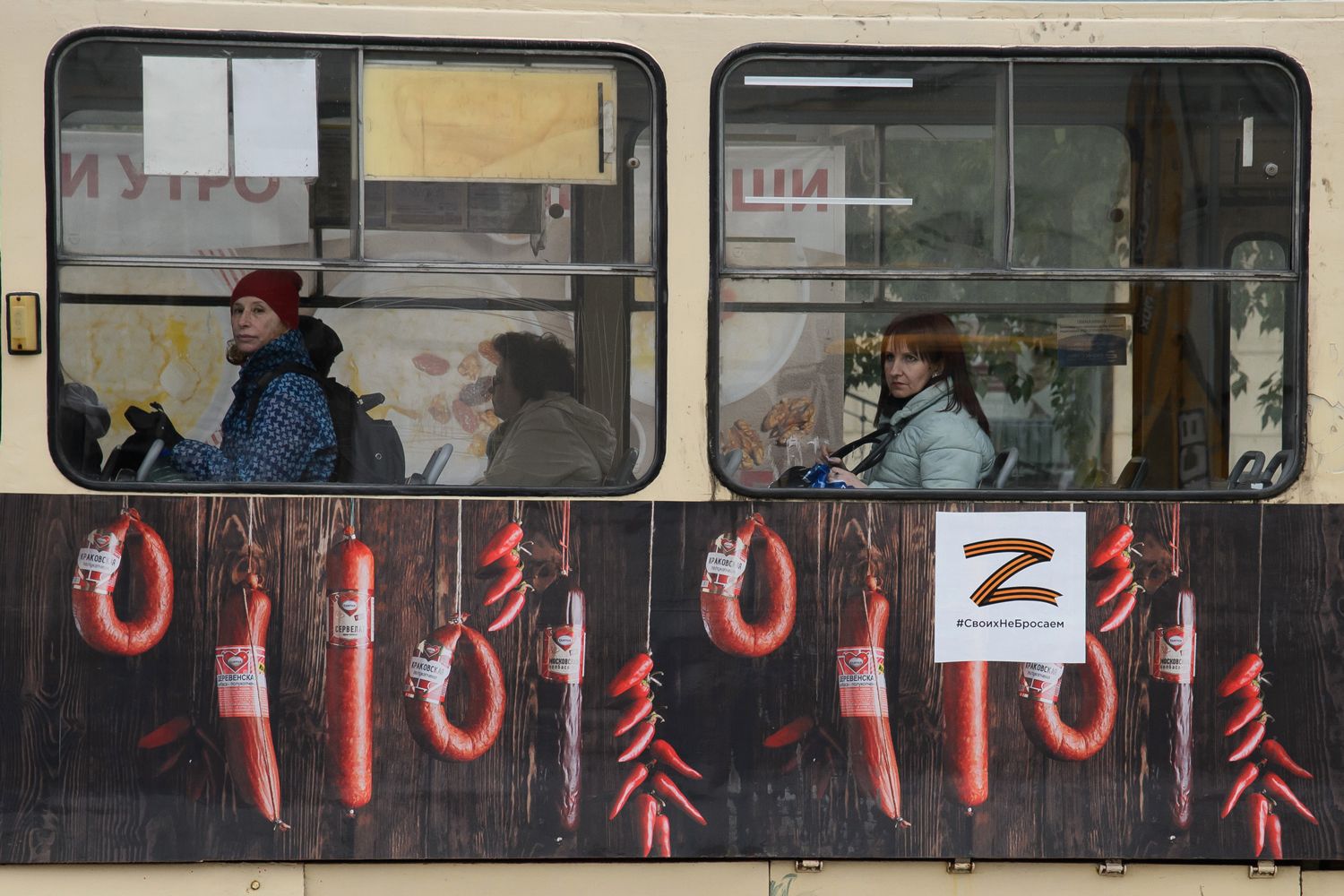 Что же касается этого снимка, то было обычное хмурое уральское утро, и я увидел трамвай, в котором ехали хмурые женщины. Казалось бы, все как обычно, но «зига» на фоне колбасы придала кадру чудовищный сюрреалистический смысл. Какая-то обреченность и безнадега появилась в этой карточке.