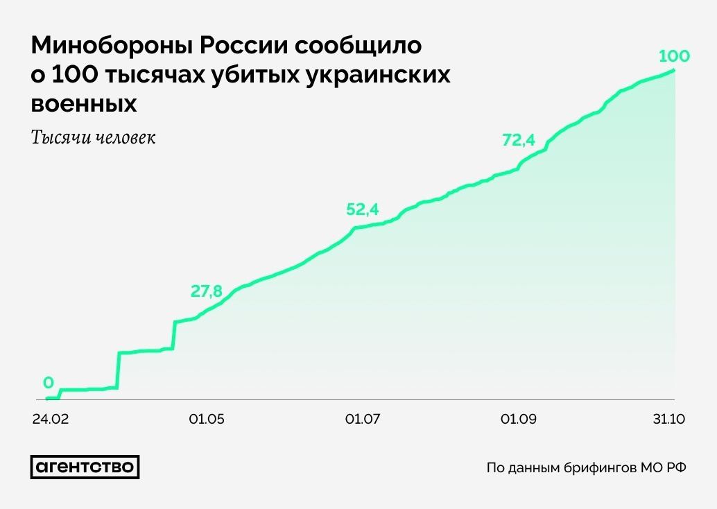 Официальный представитель Минобороны Игорь Конашенков на ежедневном брифинге сообщил, что за последние сутки были убиты 410 украинских военных. После этого общее число потерь украинской армии, согласно ежедневным брифингам российского военного ведомства, достигло 100 147 человек, свидетельствуют подсчеты «Агентства».