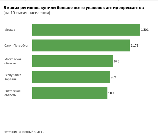 Согласно данным «Честного знака», предоставленным «Бумаге», за первые девять месяцев 2022 года в Петербурге купили 568,5 тысячи упаковок антидепрессантов — на 68 % больше, чем за аналогичный период 2021 года. Сумма затрат на успокоительные средства у петербуржцев увеличилась на 87 % и достигла значения в 479,9 миллиона рублей.