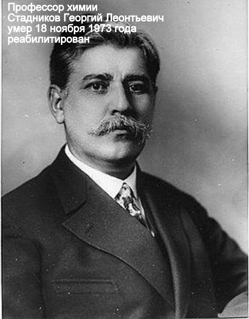 Российский и советский химик, совместно с Зелинским открывший еще в 1906 году реакцию получения альфа-аминокислот, Георгий Стадников в первый раз был арестован ВЧК в 1920 году и условно приговорен к расстрелу. Спустя два года приговор отменили, а в 1938 году арестовали вновь «за участие в национал-фашистской организации в Академии наук». Он получил срок 20 лет лагерей и отправлен сначала в Ухтижемлаг, а затем в Воркуту, где числился лаборантом углехимической лаборатории комбината «Воркутауголь». После реабилитации в 1955 году вернулся в Москву и приступил к работе в Институте нефти АН СССР. Георгий Леонтьевич внес большой вклад в органическую теорию происхождения угля и нефти.