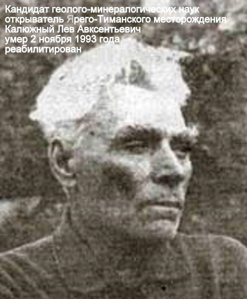 Геолога Василия Калюжного арестовали в 1938 году по обвинению к принадлежности к антисоветской организации и приговорили к восьми годам лагерей. Срок отбывал в Ухтижемлаге сначала в качестве разнорабочего, затем геолога. За эти годы он установил промышленное содержание двуокиси титана в Ярегском нефтяном месторождении и доказал необходимость постановки разведочных работ и технологических исследований. После освобождения в 1945 году остался в Ухте, где руководил литолого-петрографической группой в Центральной научно-исследовательской лаборатории Ухтинского комбината и преподавал в Ухтинском горно-нефтяном техникуме. Лишь после реабилитации в 1955 году он смог вернуться в Москву. В 1977 году получил Государственную премию СССР за открытие, разведку и подготовку комплексной разработки Ярегского месторождения титана.