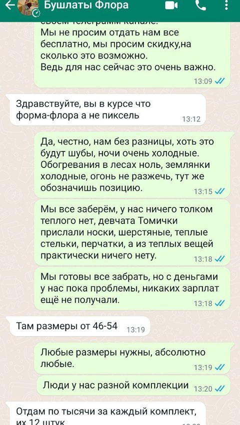Из опубликованной переписки мобилизованного по имени Владимир с продавцом также следует, что у них «ничего толком теплого нет»: «Девчата томички прислали носки шерстяные, теплые стельки, перчатки, а из теплых вещей практически ничего нету. Мы готовы все забрать, но с деньгами у нас пока проблемы, никаких зарплат еще не получали».