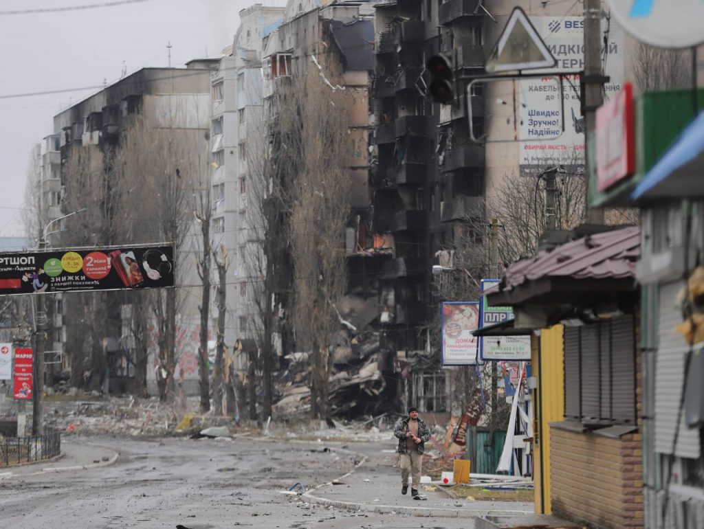 Мужчина идет по улицам маленького города Бородянка рядом с Киевом после обстрела российскими войсками, 3 марта 2022 Фото: Алиса Якубович / EPA / Scanpix