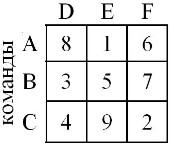 «Лучший теннисист имеет номер 9, самый слабый — номер 1 <…> Пусть строки А, В и С указывают, каким образом 9 игроков разделены на 3 команды: каждая строка соответствует составу команды. В турнире, проводимом по кругу между командами, когда каждый спортсмен из одной команды встречается с каждым спортсменом из других команд, как принято считать, побеждает сильнейший. Предположим, что команда A нанесла поражение команде B, команда B одержала победу над командой C и команда C победила команду A (в каждом случае поражение побед и проигрышей составляет 5:4). Тогда назвать сильнейшую команду не представляется возможным» 1.