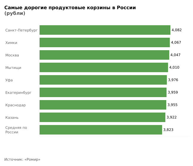 В список городов с самыми дорогими базовыми продовольственными корзинами также вошли Мытищи (4 010 рублей), Уфа (3 976 рублей), Екатеринбург (3 959 рублей), Краснодар (3 955 рублей) и Казань (3 922 рубля). Средняя цена продуктовой корзины по России составила 3 823 рубля.