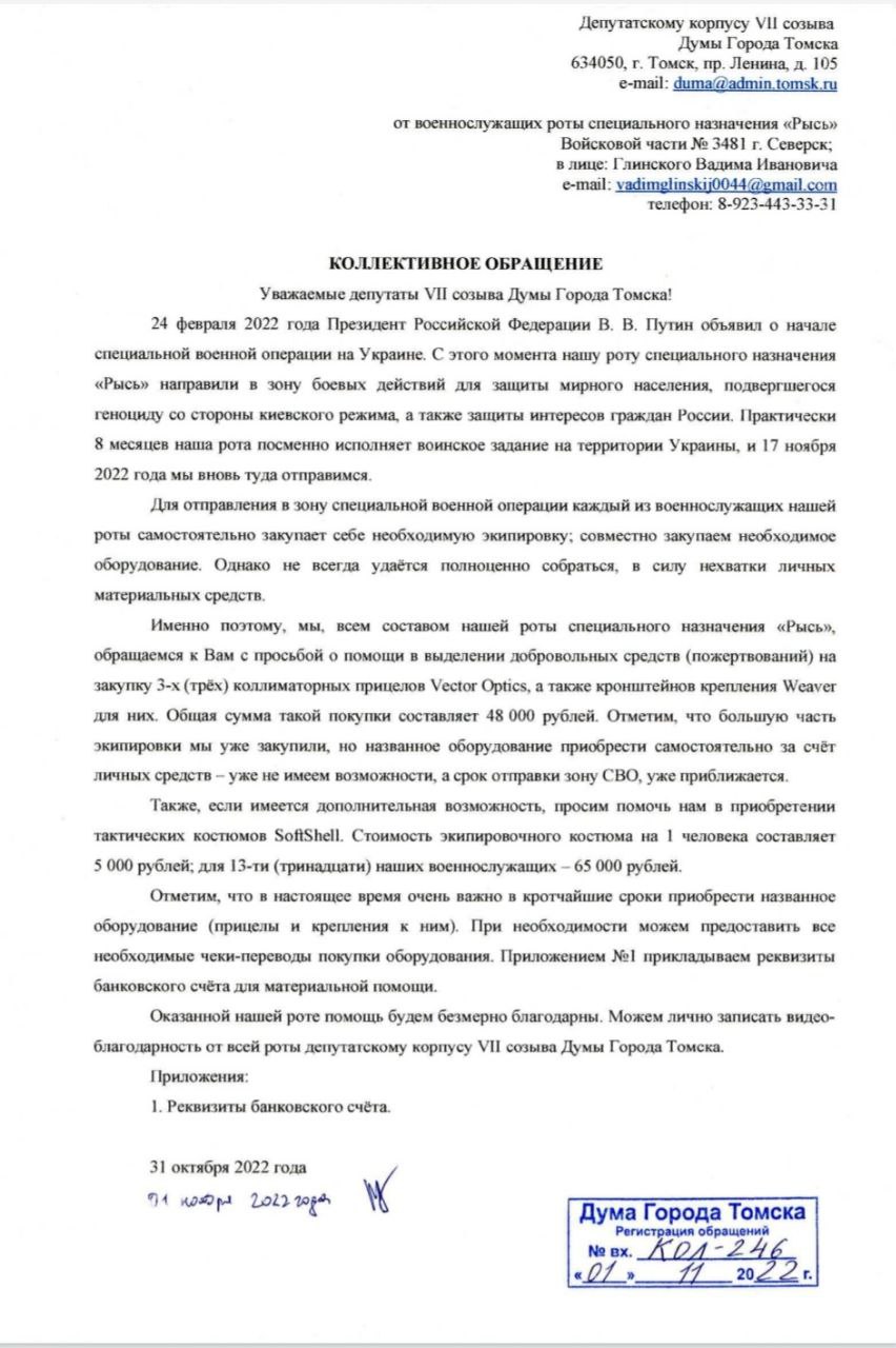 Военные роты специального назначения "Рысь" войсковой части №3481 Северска обратились к депутатам думы Томска с просьбой помочь закупить обмундирование. В обращении они рассказали, что уже закупали за свой счет необходимое оборудование, но сейчас личные средства у бойцов закончились. Копию обращения опубликовал депутата Андрей Фатеев.