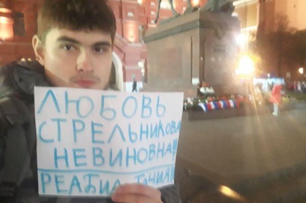 На Манежной площади в Москве задержали Михаила Суслина, который проводил пикет с плакатом «Любовь Стрельникова невиновна!!! Реабилитация!». Об этом пикетчик сам сообщил ОВД-Инфо.