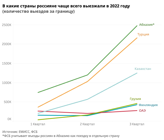 По данным ФСБ, количество поездок россиян в Казахстан, Армению, Кыргызстан, Таджикистан, Монголию и Абхазию (ФСБ учитывает въезды россиян в Абхазию как поездку в отдельную страну — прим. «Бумаги») стало рекордным за последние пять лет. При этом выезды в Абхазию, Турцию, Казахстан, Грузию и Финляндию составили 70 % от всех выездов жителей Россиян за границу.