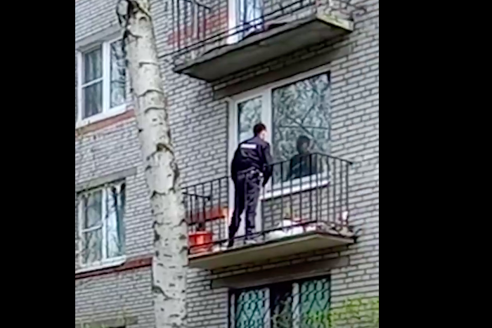 На место почти сразу приехали полицейские. Один из работников правоохранительных органов залез на балкон женщины и начал выбивать ногой дверь в квартиру.