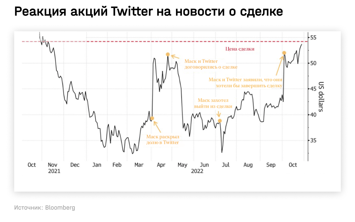 В начале октября Маск сдался, согласившись купить Twitter по заявленной цене. Закрытие сделки миллиардер отметил неожиданным появлением в офисе корпорации, сменой статуса в своем аккаунте в соцсети на Chief Twit (теперь там указано, что Маск трудится «оператором горячей линии для жалоб на Twitter») и постом с фразой «птичка на свободе».