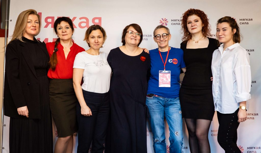 Участницы съезда. Слева направо: Елена Изотова, Ольга Подольская, Вера Мангилева, Юлия Галямина, Юлия Гринвич, Антонина Стеценко, Анастасия Мишина. Фото: медиаотдел содружества «Мягкая сила»