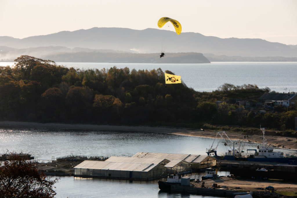 Парапланерист летит над вольерами «китовой тюрьмы» в бухте Средняя в Приморье.