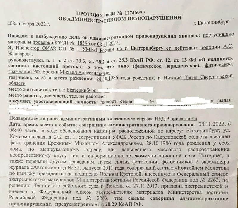 После этого Ерохина увезли в отдел полиции №1. Поводом для составления протокола послужила статья в журнале «Автоном» от 2011 года, который силовики увидели в квартире Ерохина.