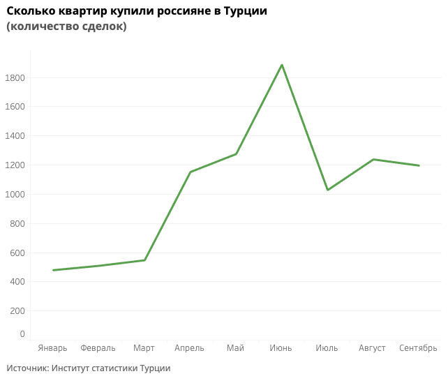 Турция. Число покупок россиянами недвижимости в стране с начала войны возросло в два раза, следует из данных Турецкого института статистики. Больше всего домов граждане России купили в июне (почти 1,9 тысячи объектов недвижимости). В среднем после начала войны россияне покупают 1,2 тысячи турецких квартир и домов в месяц.