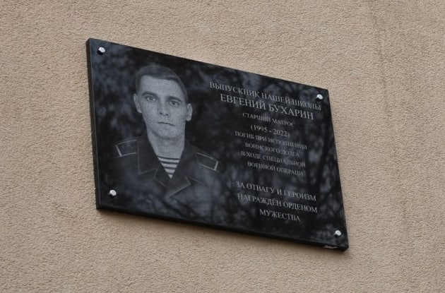 На здании симферопольской школы № 8 появилась мемориальная доска с изображением российского военного Евгения Бухарина, погибшего в Мариуполе в ходе «специальной военной операции» (так власти РФ называют войну против Украины). Об этом сообщила российская администрация города.