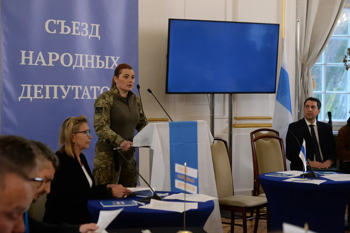 Кроме Гончаренко Украину на Съезде народных депутатов очно представляла депутат Верховной рады Людмила Буймистр, вышедшая на сцену в форме ВСУ. Она рассказала, что родилась в России (она закончила там МГИМО и работала в ЮКОСе).