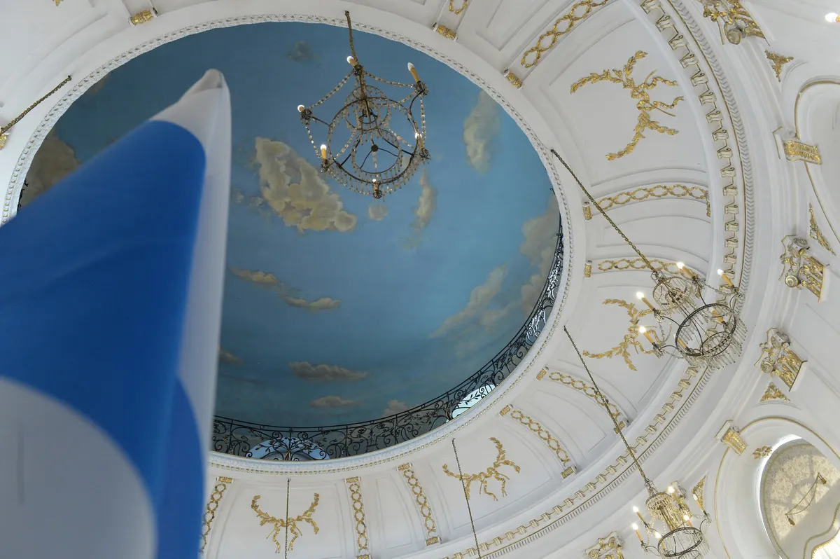 Организаторы якобы узнали об этом, уже приехав в Польшу, поэтому экстренно менять место проведения не стали. Понять их, конечно, можно, ведь зал в Яблоннском дворце прекрасный: круглый, белоснежный, с позолоченной лепниной, высокими зеркалами и фреской с голубым и слегка облачным небом на потолке.