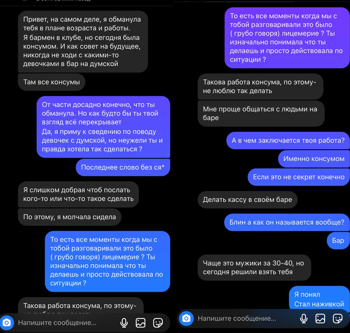 Читатель «Бумаги» Константин рассказал, как в октябре 2022 года попал в похожую ситуацию на Думской улице. «Консуматорша» привела молодого человека в бар, где за один напиток ему выставили многократно превышающий стоимость заказанного счет. Однако у петербуржца с собой была лишь 1 тысяча рублей.