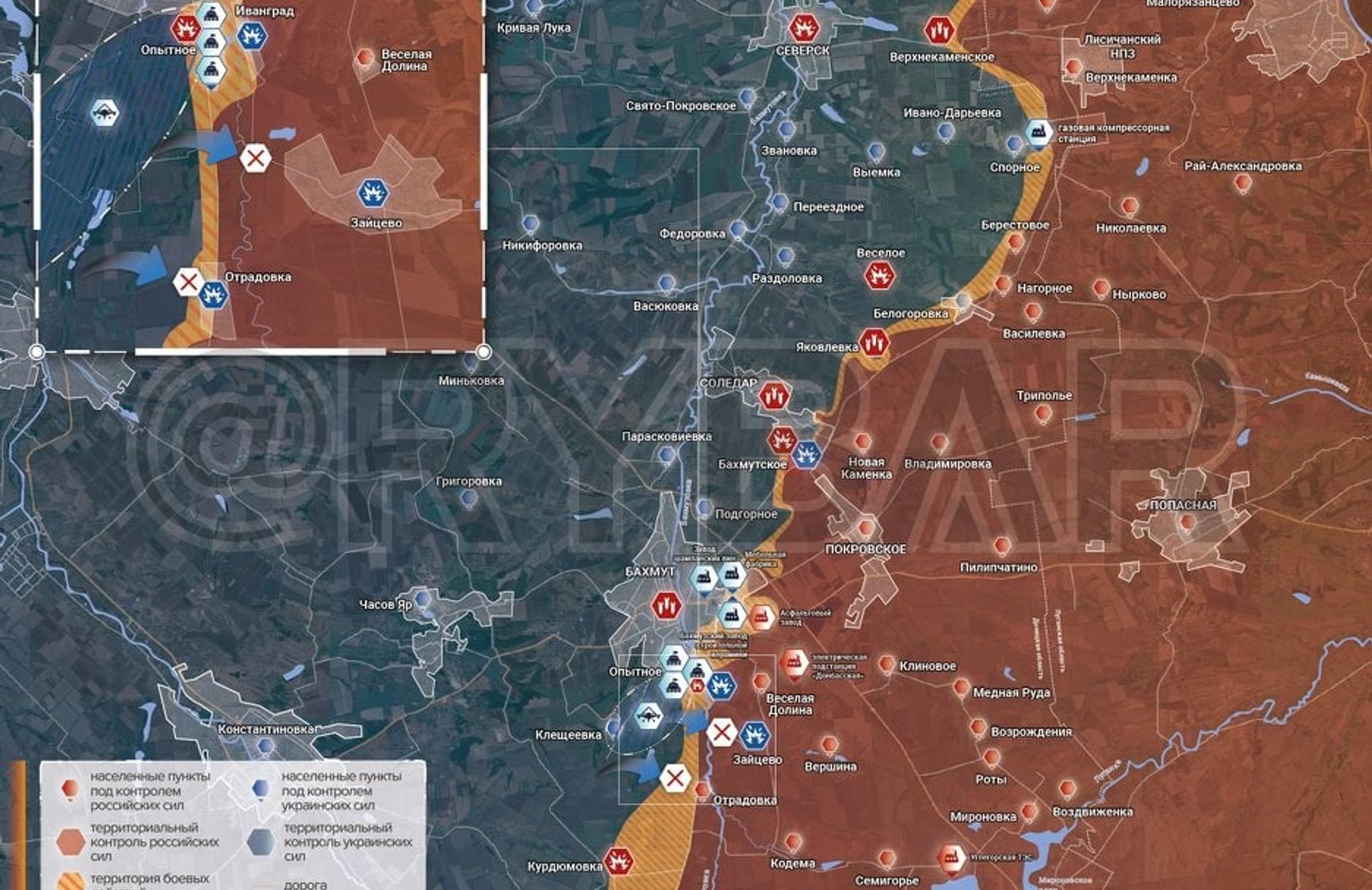 Пророссийские Telegram-каналы сообщают, что войска РФ сегодня взяли Опытное и немного продвинулись в Первомайском. Продолжаются бои за Водяное. План наступления, как отмечает эксперт Центра военно-политической журналистики Борис Рожин, достаточно прозрачен: взять Первомайское и Водяное и повернуть на Тоненькое, взятие которого позволит установить огневой контроль над дорогой Орловка — Авдеевка, что создаст прямую угрозу оперативного окружения Авдеевской группировки ВСУ.