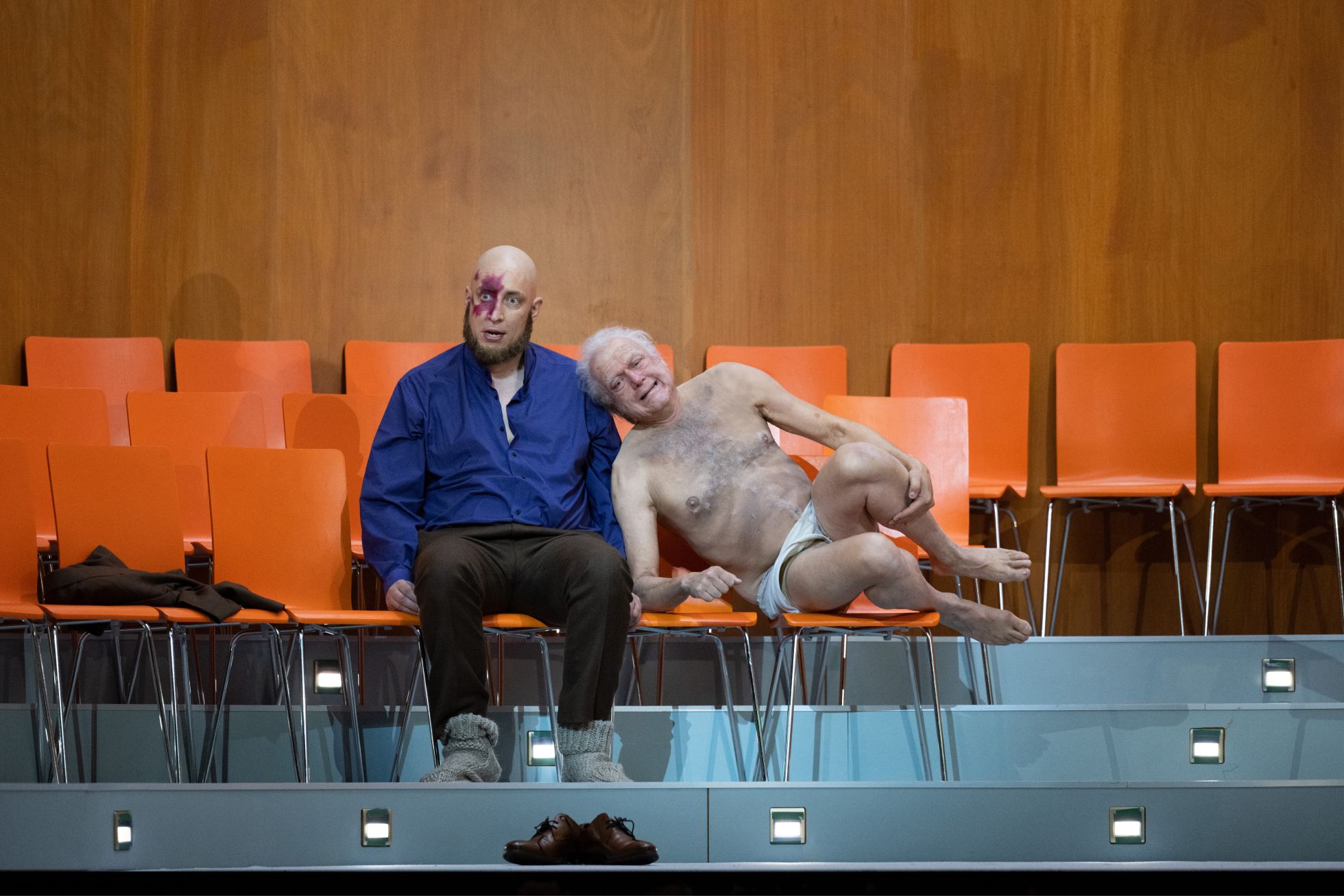 Вотан, Альберих, Миме, Эрда постепенно превращаются в пациентов всемирного хосписа или персонажей Ульриха Зайдля, еле-еле двигающихся по сцене при помощи тростей или ходунков. Дряхлеют «три девушки в голубом» — прорицательницы-норны, впервые поющие только в четвертой опере, но, по версии Чернякова, присутствующие и плетущие нить судьбы на протяжении всего действия. Ученые постепенно впадают в маразм, уступая плацдарм «грядущему хаму» — крепкому Хагену (вновь Мика Карес, чье лицо отмечено красным родимым пятном, будто кровавым), и его жестокое правление напоминает уничтожение научного института неонацистом Тесаком в «Дау» Ильи Хржановского. Дополнительным драматизмом наполняется сцена расставания взрослой дочери Брунгильды с отцом Вотаном. У измены Зигфрида появляется веский мотив — он просто устал от жены, ему нужен кто-то помоложе и повеселее.