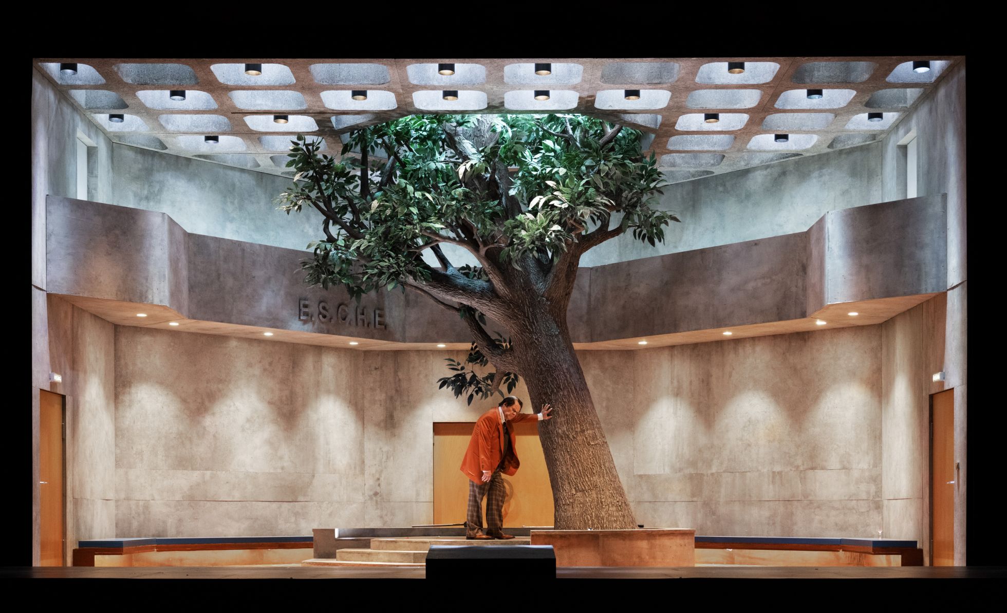 Учреждение, растущее и расширяющееся на глазах пораженного зрителя вправо, влево, вглубь, вверх и вниз — и правда, целая вселенная в коробке одной сцены, — называется E.S.C.H.E, «ясень». В немецком слове невольно слышится и русское «еще», подчеркивающее чрезмерность амбиций героев тетралогии (ее автора и постановщика тоже — без этого «Кольцо» не понять). Но вообще речь идет о материале — мировом древе Иггдрасиле, растущем прямо посреди фойе, из ветви которого сделано магическое копье Вотана. Сам бог — немецкий баритон Михаэль Фолле, с его сильным выразительным голосом и незаурядными актерскими способностями, стал главной суперзвездой постановки — директор института, проводящий опыты над людьми. Другие боги — научные сотрудники.