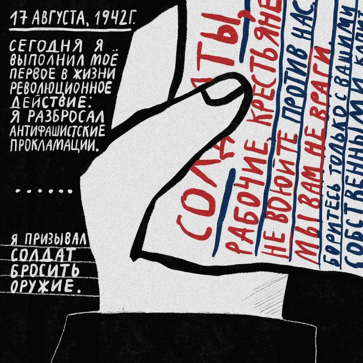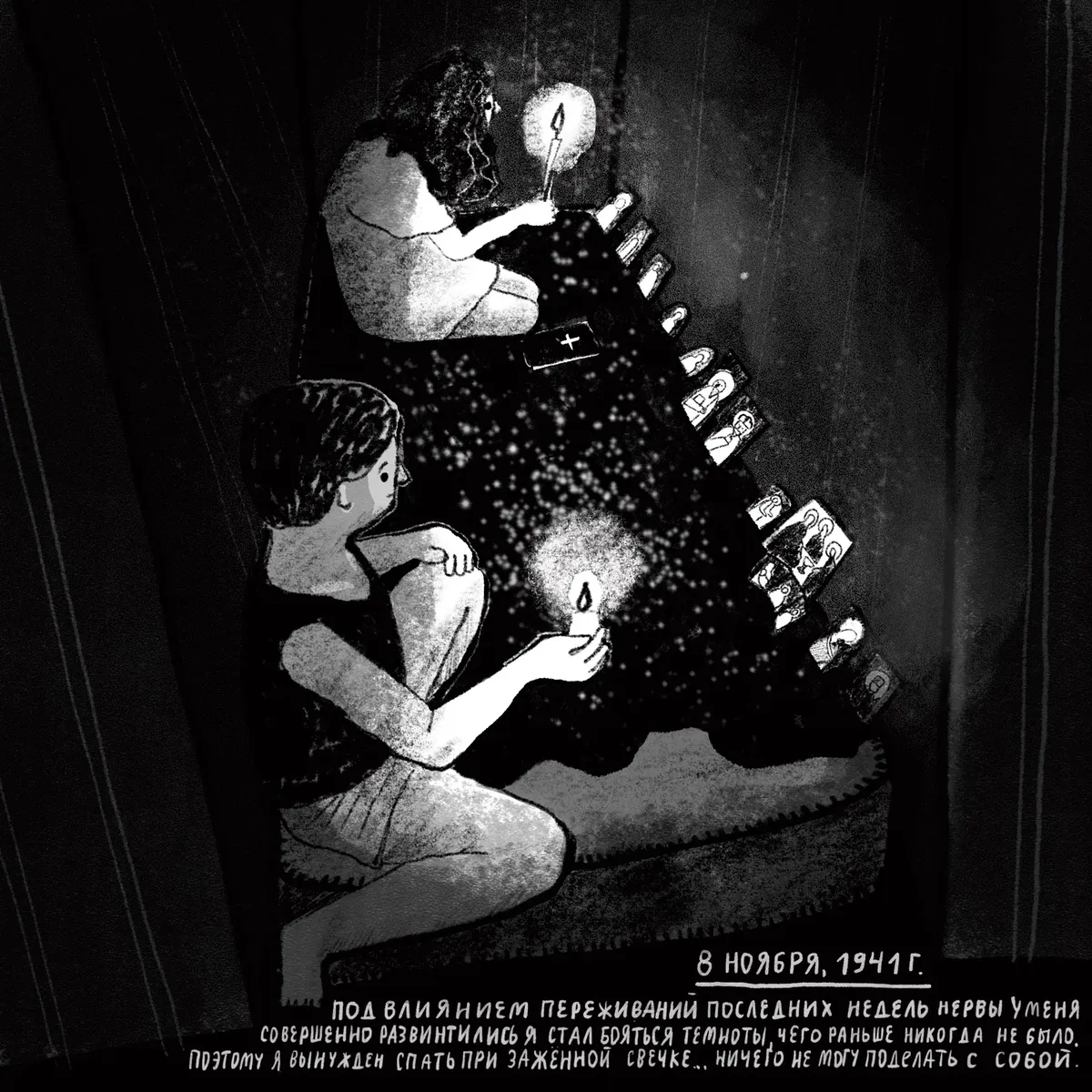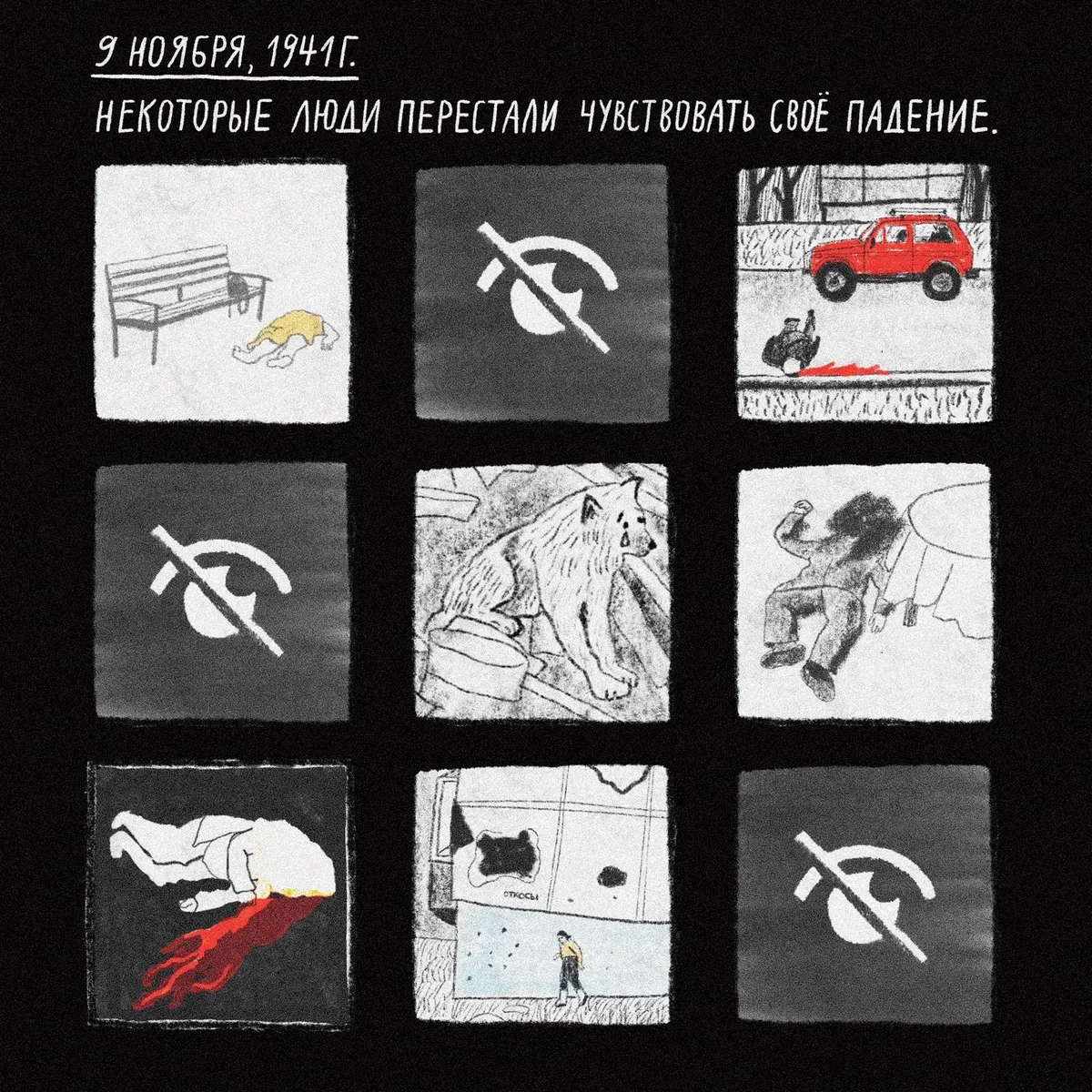 Я продолжаю рисовать для «Мемориала». Иллюстрирую, например, военные дневники 1941–1945 года, которые мы публикуем в наших социальных сетях. Эти дневники из разных городов бывшего союза: оккупированных Таганрога, Одессы, Харькова, блокадного Ленинграда. Какая бы война ни была, все испытывают страх, ужас, лишения, потери. Люди пишут в комментариях: «Я не могу понять, какой это год. 42-й? А мне кажется, что я читаю про 22-й». Важно показывать, что война недопустима.