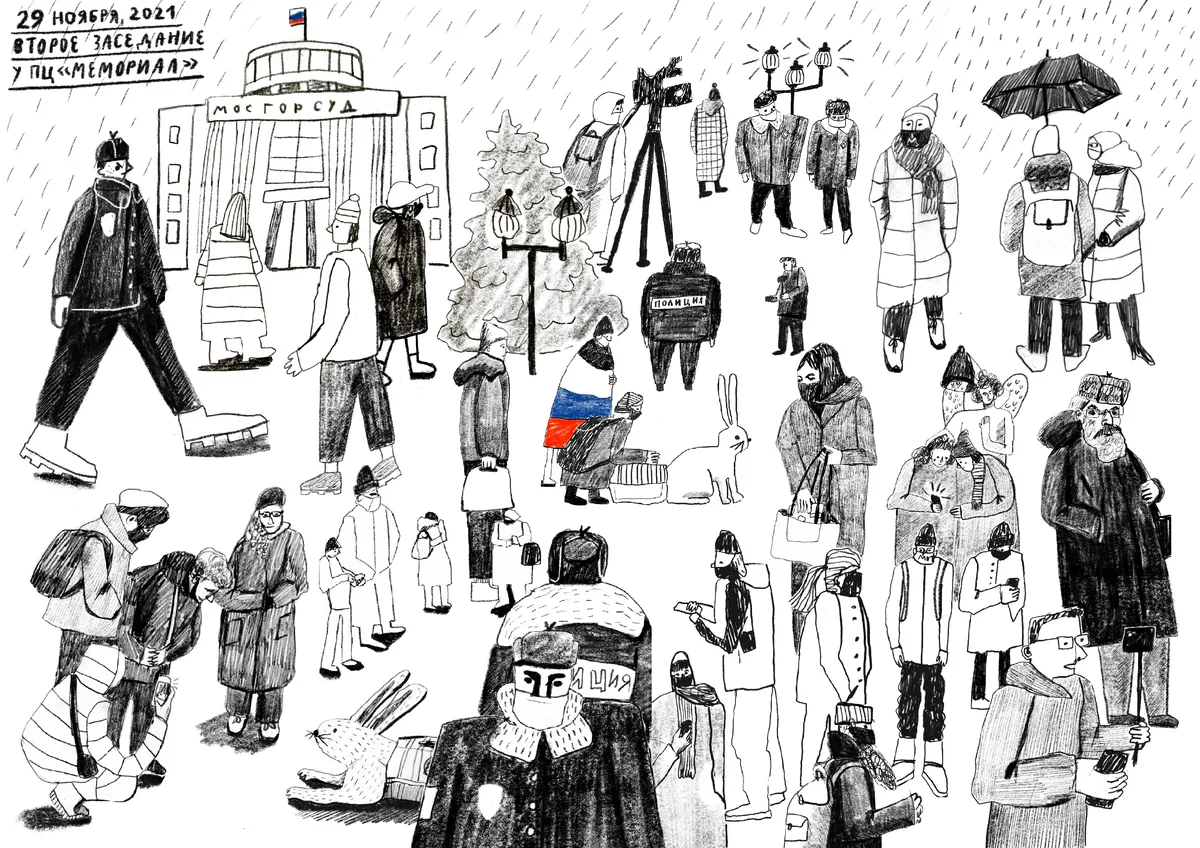 Потом я собиралась ехать в свой родной город Красноярск. И «Мемориал» тоже туда поехал — на книжную ярмарку. Там я тоже рисовала, делала скрайбинг — это такие иллюстративные конспекты открытых столов и дискуссий, которые они там проводили. А когда мы все вернулись в Москву, была вечеринка в честь 10-летия здания «Мемориала» на Каретном ряду. И через несколько дней пришел иск о ликвидации.