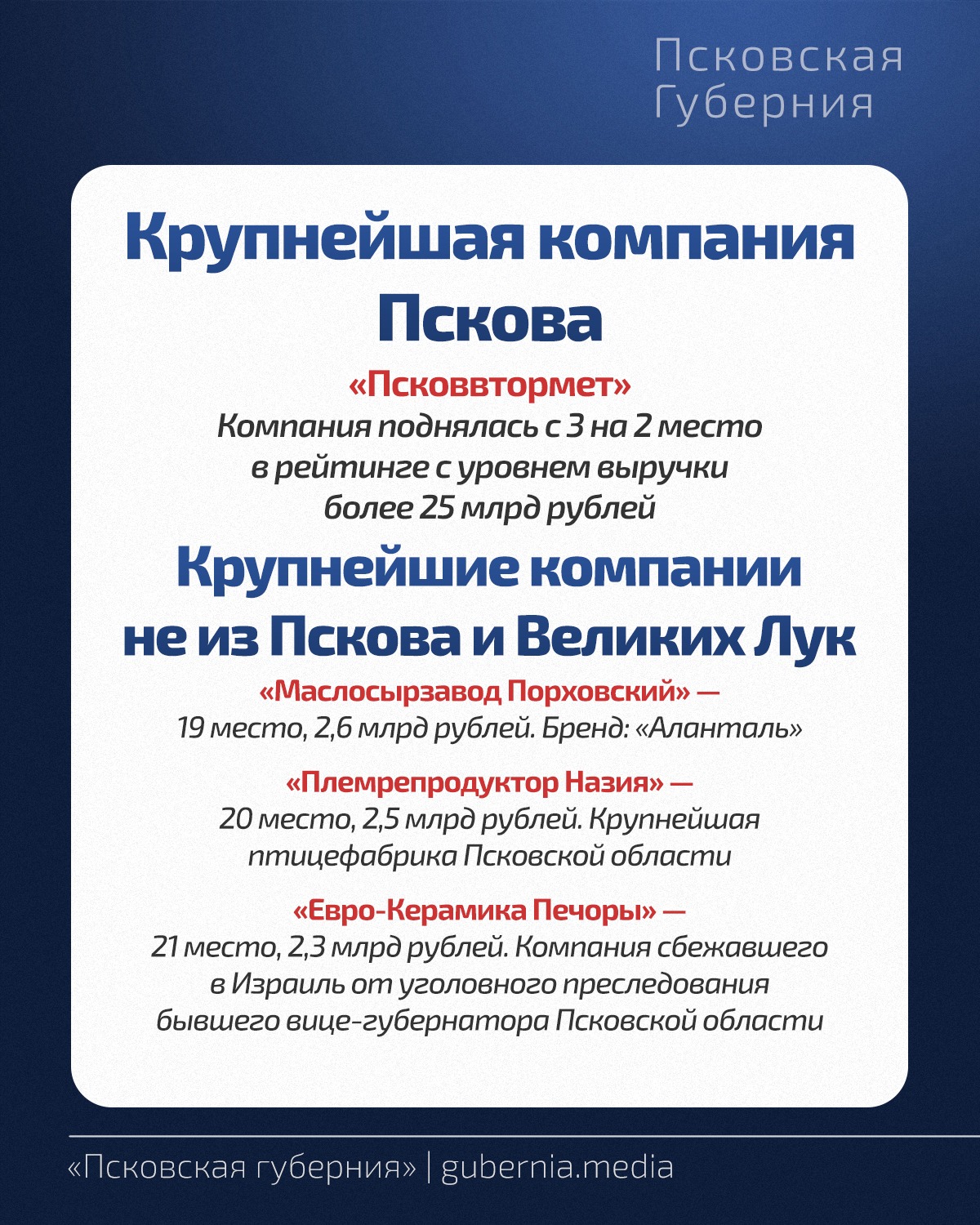 Псковский «Псковвтормет» теперь на 2 месте, а завод «ЗЭТО» депутата Госдумы Козловского потерял две позиции и теперь на 9 месте. «Газпром межрегионгаз» вылетел из десятки и теперь с псковскими фирмами в топ-10 совсем туго.