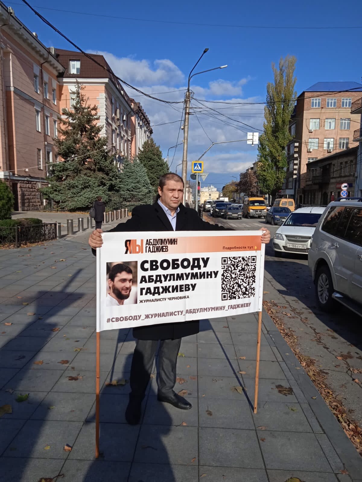 В Махачкале прошли одиночные пикеты с требованием освободить от уголовного преследования журналиста газеты "Черновик" Абдулмумина Гаджиева и остальных политических заключенных.