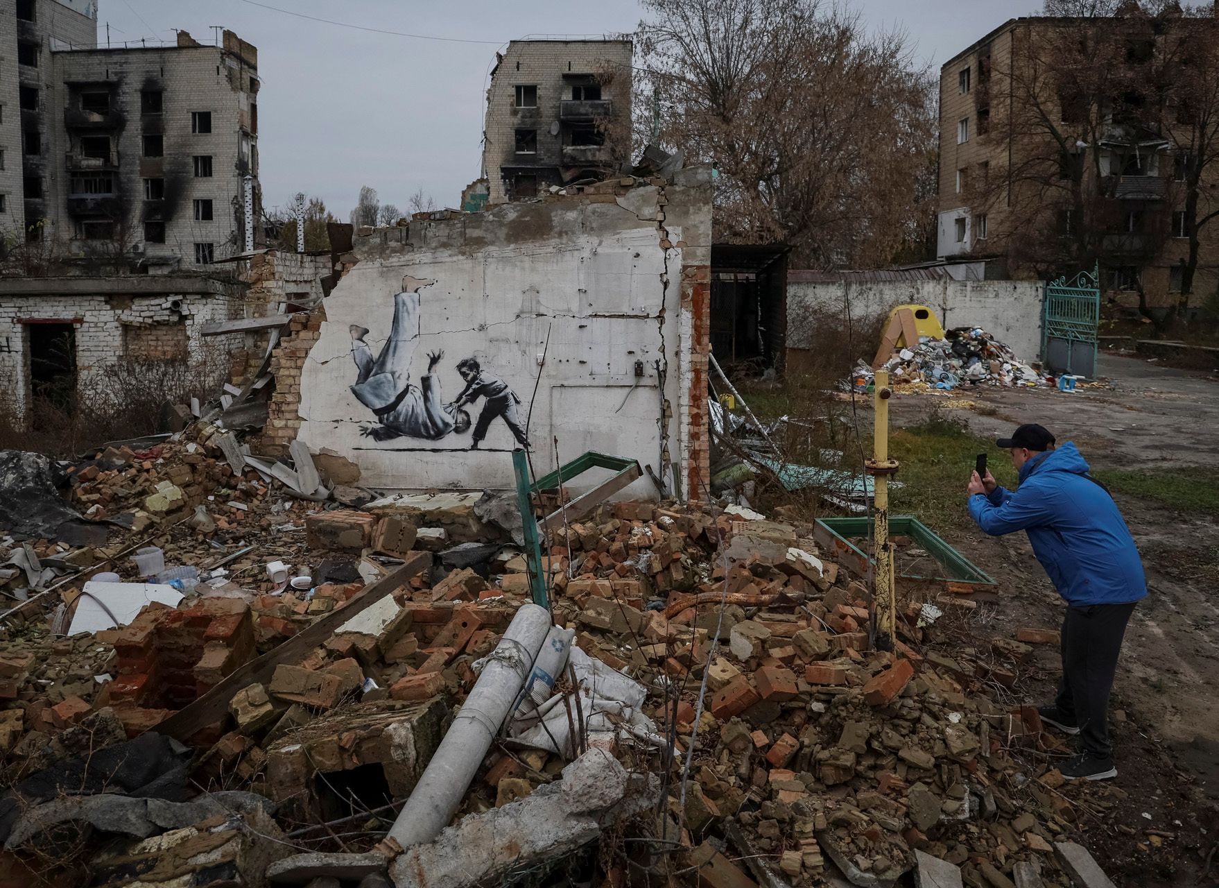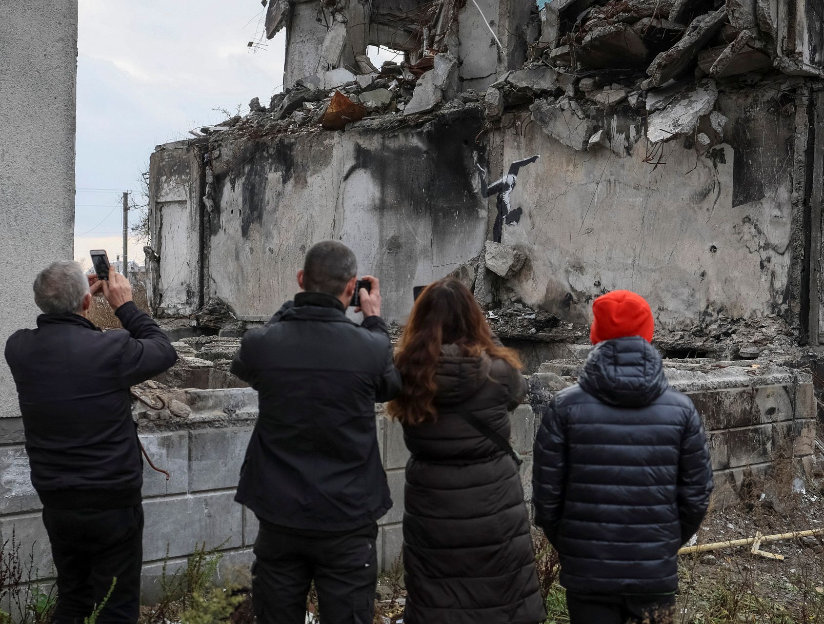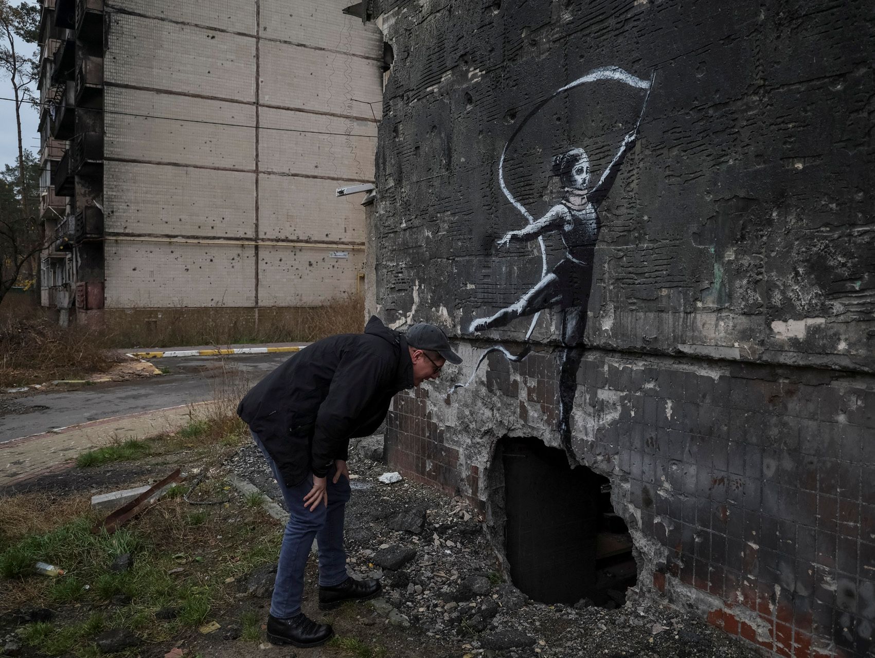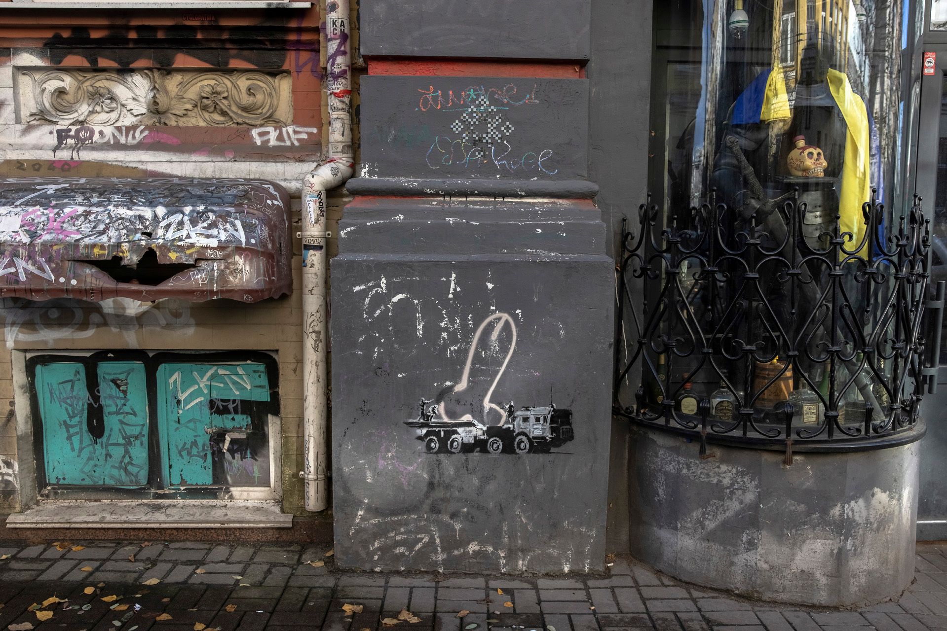 12 ноября в разрушенной Бородянке под Киевом появились три граффити, по стилю напоминающих работы Бэнкси. Вскоре знаменитый анонимный художник подтвердил, что одно из них сделал он. С тех пор в Киеве и близлежащих городах появилось еще несколько граффити, похожих на стрит-арт Бэнкси. Их авторство не подтверждено, но они уже стали достопримечательностями. Первое подобное граффити появилось в центре Киева — на Майдане — еще десять дней назад. Теперь его тоже приписывают Бэнкси.