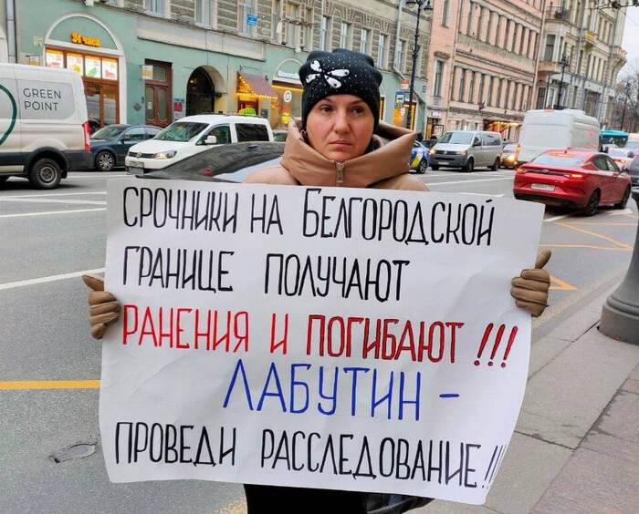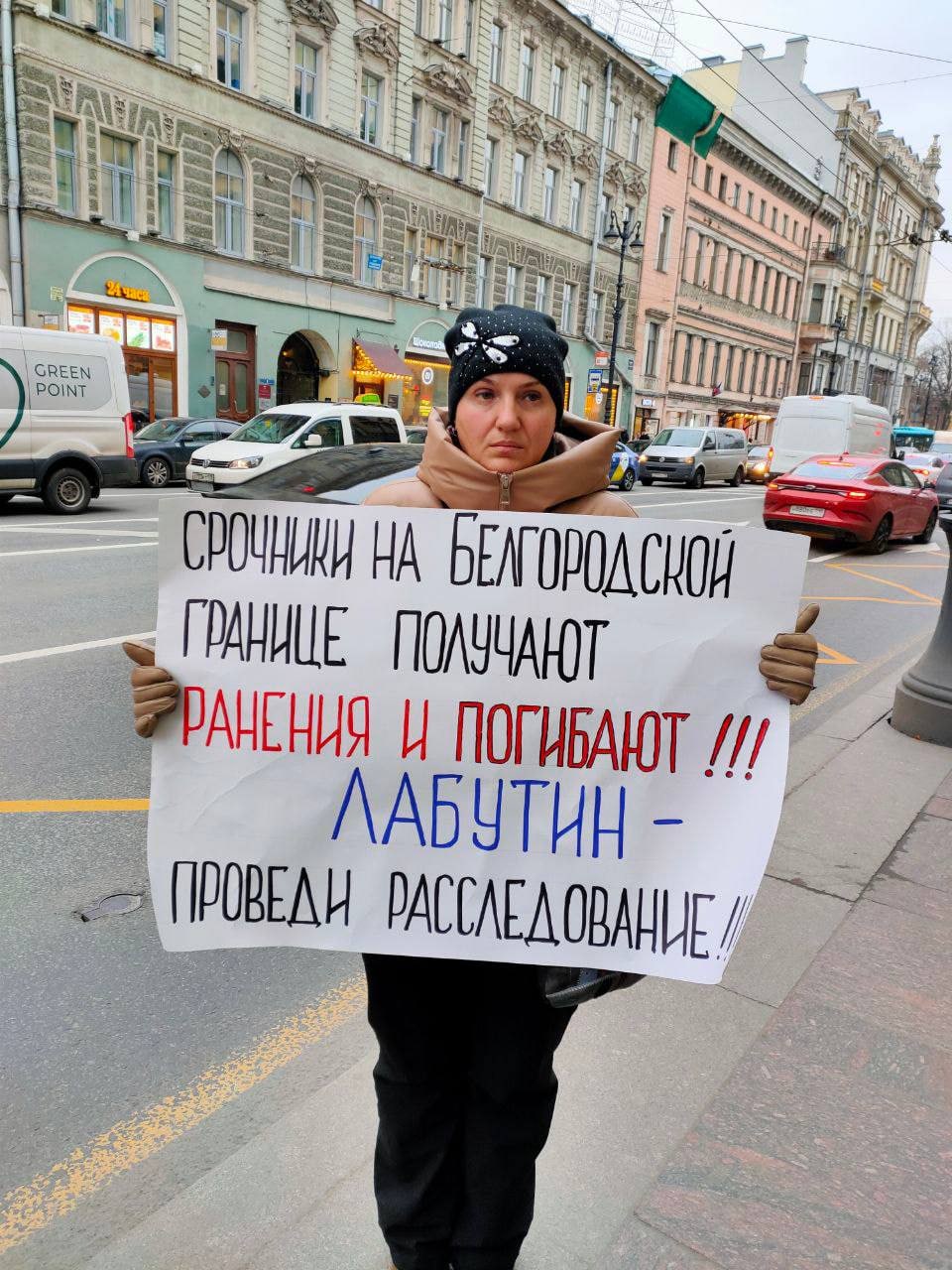 Детали. «Срочники на белгородской границе получают ранения и погибают! Лабутин [военный прокурор Западного округа] — проведи расследование!» — было написано на плакате женщины, стоявшей на Невском. Она рассказала в эфире, что приехала в Петербург из Томска и впервые вышла на акцию из-за своего 20-летнего племянника. Его призвали на срочную службу в июне.