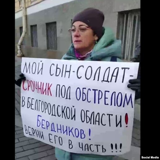 Туда же с пикетом вышла мать другого срочника из Томска. Она держала в руках плакат: "Мой сын солдат-срочник под обстрелом в Белгородской области. Бердников! Верни его в часть!". Генерал-майор Роман Бердников возглавляет командование Западного военного округа.