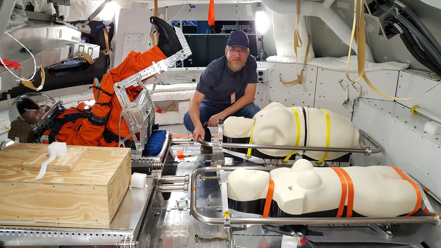 Lockheed Martin / DLR / NASA Расположение трех манекенов-астронавтов в корабле «Орион». В оранжевом американский «Командир Муникен Кампос», который должен проверить динамические нагрузки на человеческое тело и два манекена эксперимента Matroshka — Хельга и Зоар