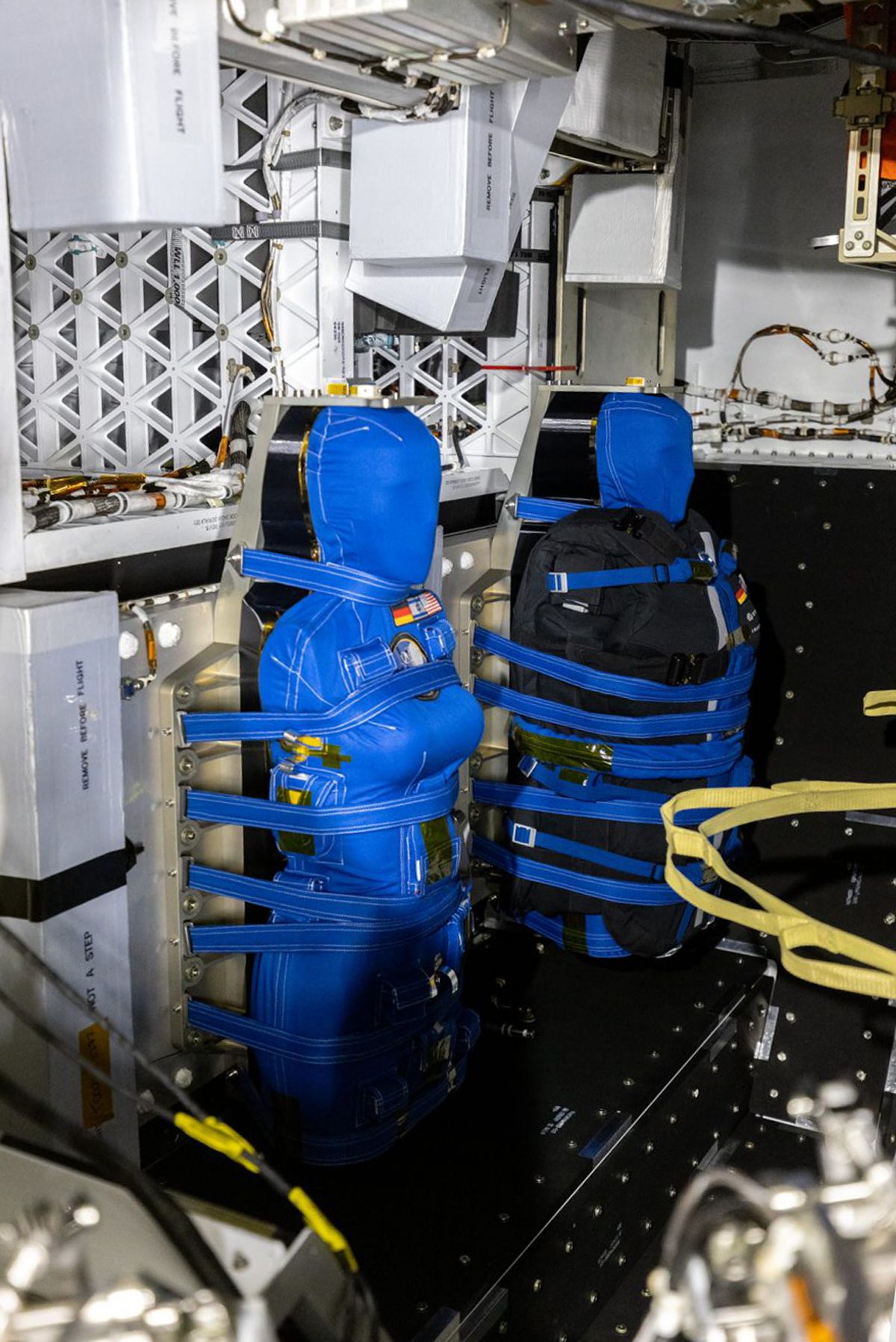 Frank Michaux / NASA Манекены Хельга и Зоар на пассажирских сиденьях внутри модуля экипажа корабля «Орион» миссии «Артемида» во время подготовки к полету. Зоар — тот манекен, что «одет» в защитный жилет