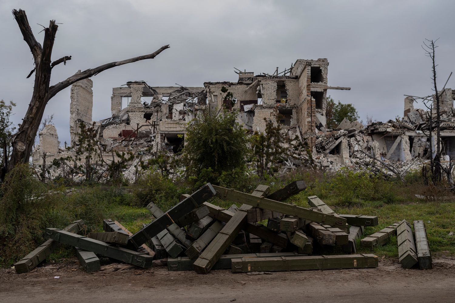 Ящики с боеприпасами возле разрушенной школы на окраине недавно освобожденного села в Херсонской области