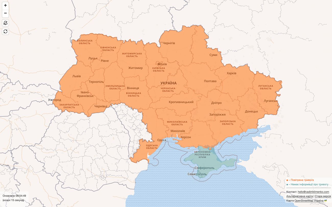 В центральных, южных и восточных регионах Украины, а также в Киеве объявлена воздушная тревога